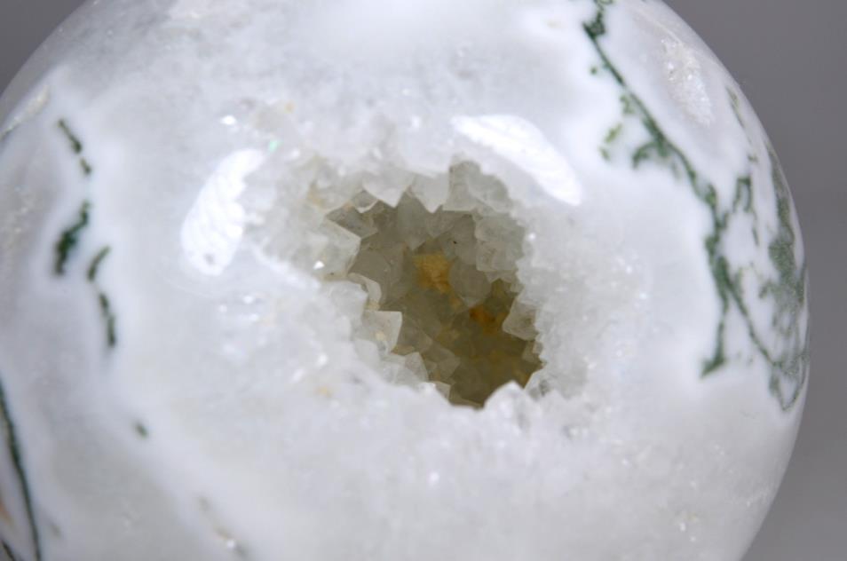 This Large Druzy Moss Agate Sphere showcases stunning milky White Quartz/ White Agate adorned with dark and verdant green tree-like, moss-like dendritic patterns.