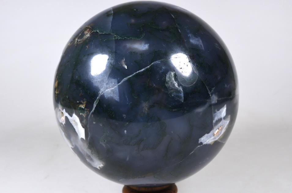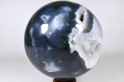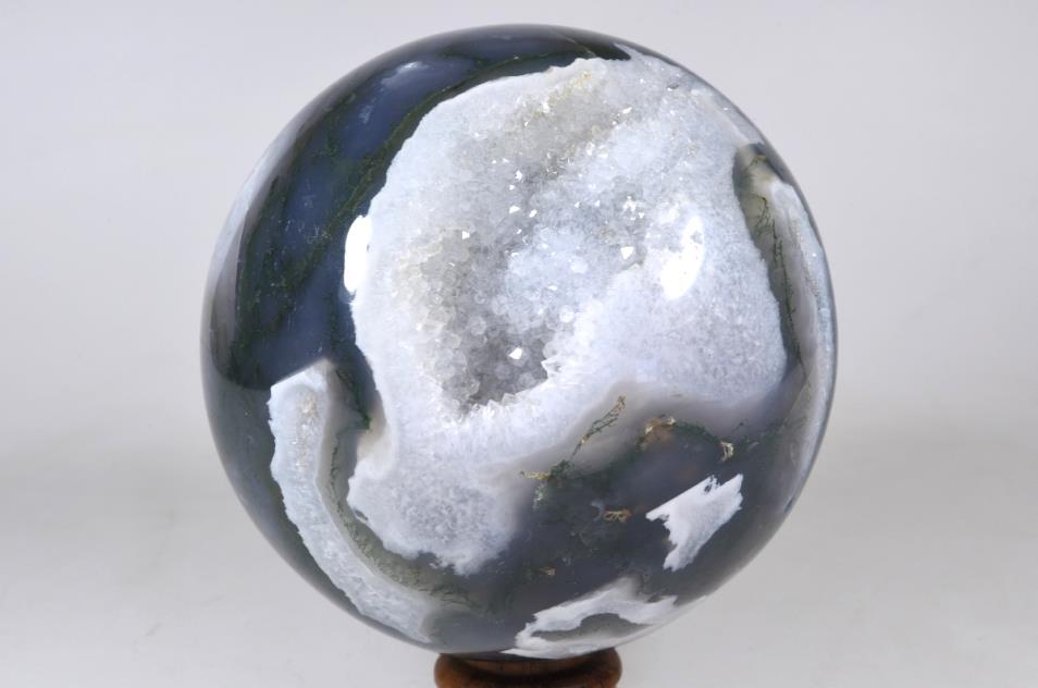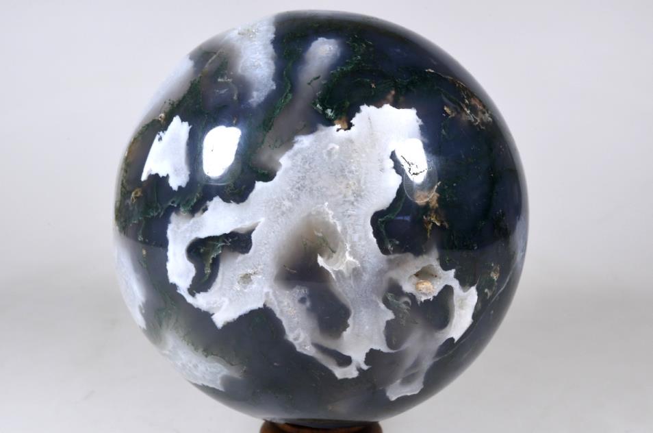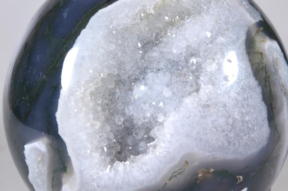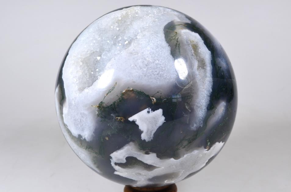This Large Druzy Moss Agate Sphere showcases stunning milky White Quartz/ White Agate and gorgeous translucent Blue-Grey Agate/ Blue-Grey Chalcedony adorned with dark and verdant green tree-like, moss-like dendritic patterns.