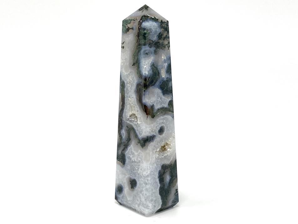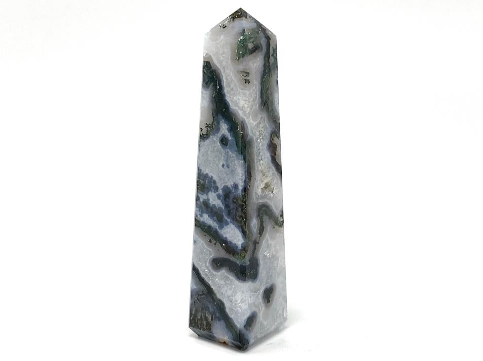 This gorgeous Druzy Moss Agate Crystal Tower (also known as a Druzy Tree Agate Crystal Tower) measuring 9.6cm tall has been carefully cut and polished from Green Moss Agate Stone into a crystal tower/ obelisk shape, with a free-standing square-shaped base, four polished faces, and sharp pointed tip.