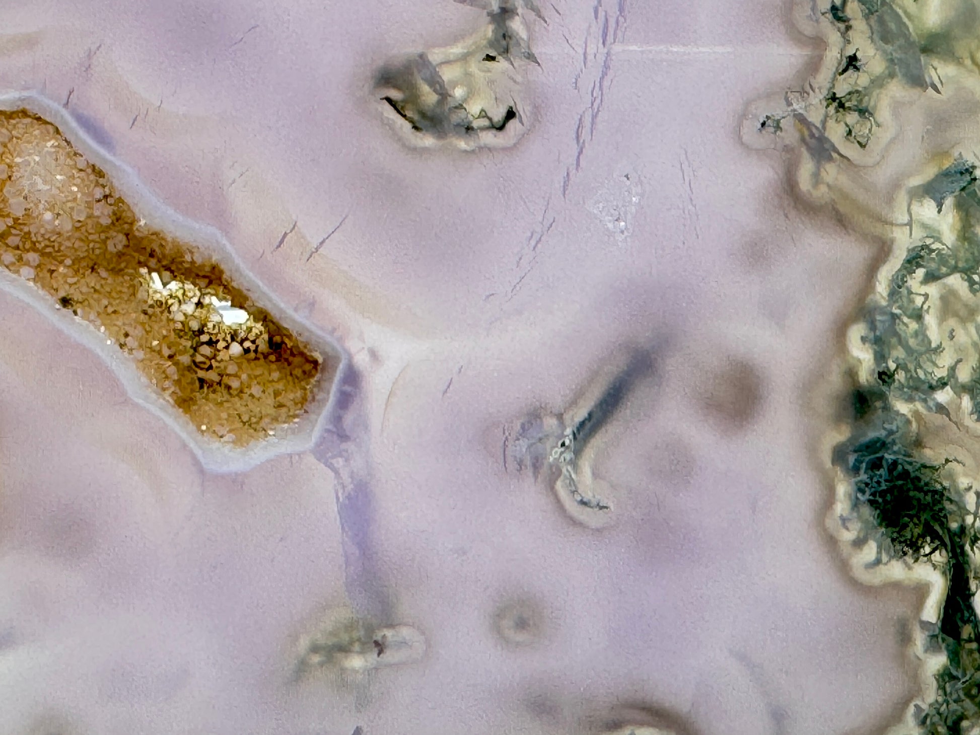 Purple Moss Agate Crystals display the same green moss-like dendritic patterns so revered in typical Moss Agate (Tree Agate) but instead of tree-like white and green colouring, this Druzy Purple Moss Agate Slice stuns with translucent Purple Chalcedony, which ranges in hue from lilacs and lavenders to hints of deep indigo.