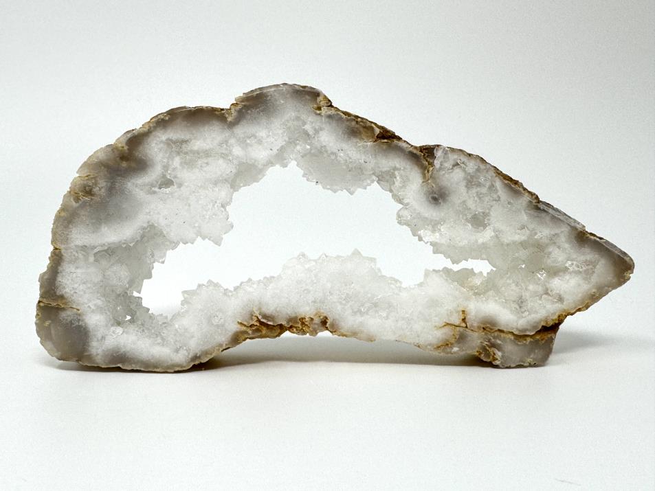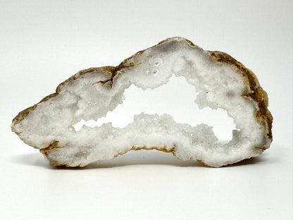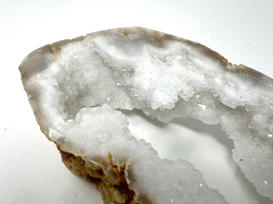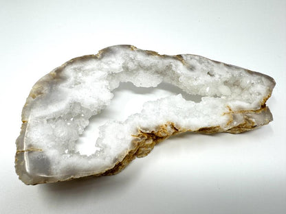 This stunning Druzy Quartz Geode Slice measuring 17.2cm long displays a gorgeous snow-white colour and sparkling druzy crystals.