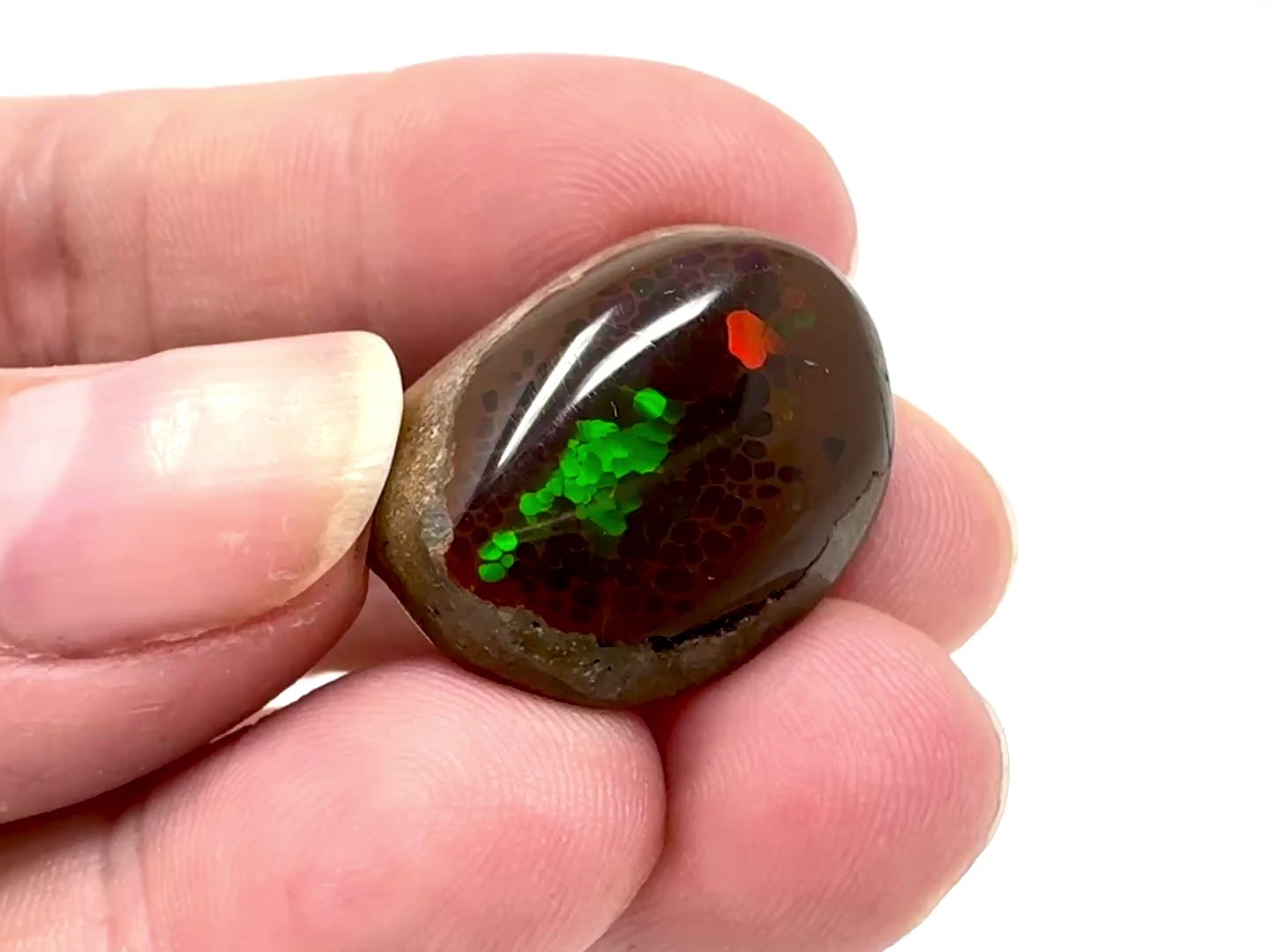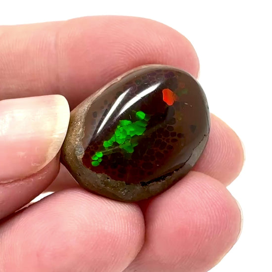 The Chocolate Opal body colour is a lovely rich chocolate brown hue, whilst the opalescent play of colour dances and flashes mesmerisingly in an array of fiery hues; usually in shades of red, green, yellow, and orange that creates an iridescent effect akin to the fiery flash of Fire Opals, Ammolite, and Fire Ammonites (also known as Red Iridescent Ammonites).