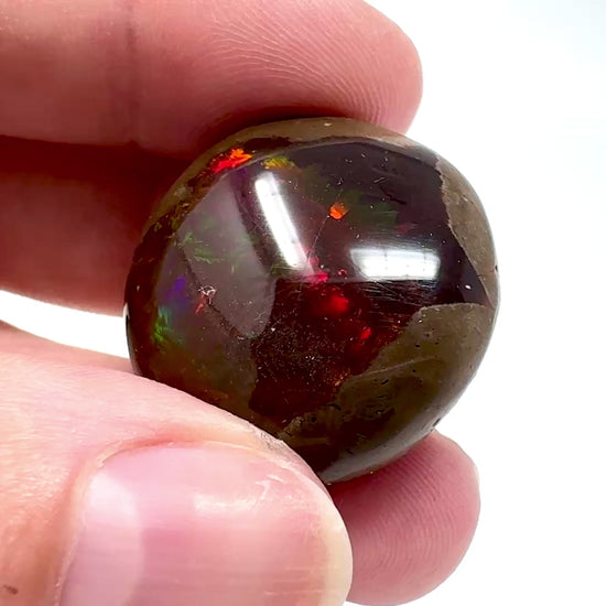 The Chocolate Opal body colour is a lovely rich chocolate brown hue, whilst the opalescent play of colour dances and flashes mesmerisingly in an array of fiery hues; usually in shades of red, green, yellow, and orange that creates an iridescent effect akin to the fiery flash of Fire Opals, Ammolite, and Fire Ammonites (also known as Red Iridescent Ammonites).