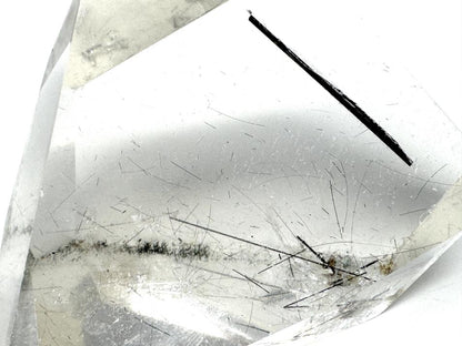 When the Quartz crystal was growing, or even before growth, minerals (in this case, Black Tourmaline) grew to be surrounded by the Clear Quartz. These minerals, which are sometimes too delicate to survive unprotected, were consequently protected by the Quartz. The clarity of the Quartz crystal provides a window through which to view the Black Tourmaline inclusions that it protects.