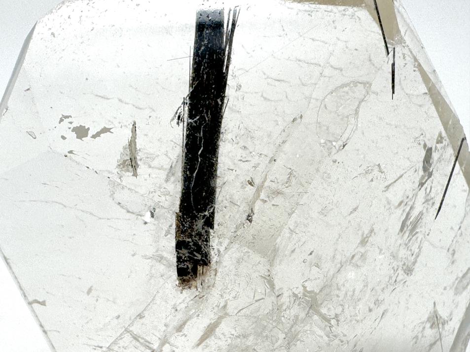 When the Quartz crystal was growing, or even before growth, minerals (in this case, Black Tourmaline) grew to be surrounded by the Clear Quartz. These minerals, which are sometimes too delicate to survive unprotected, were consequently protected by the Quartz. The clarity of the Quartz crystal provides a window through which to view the Black Tourmaline inclusions that it protects.