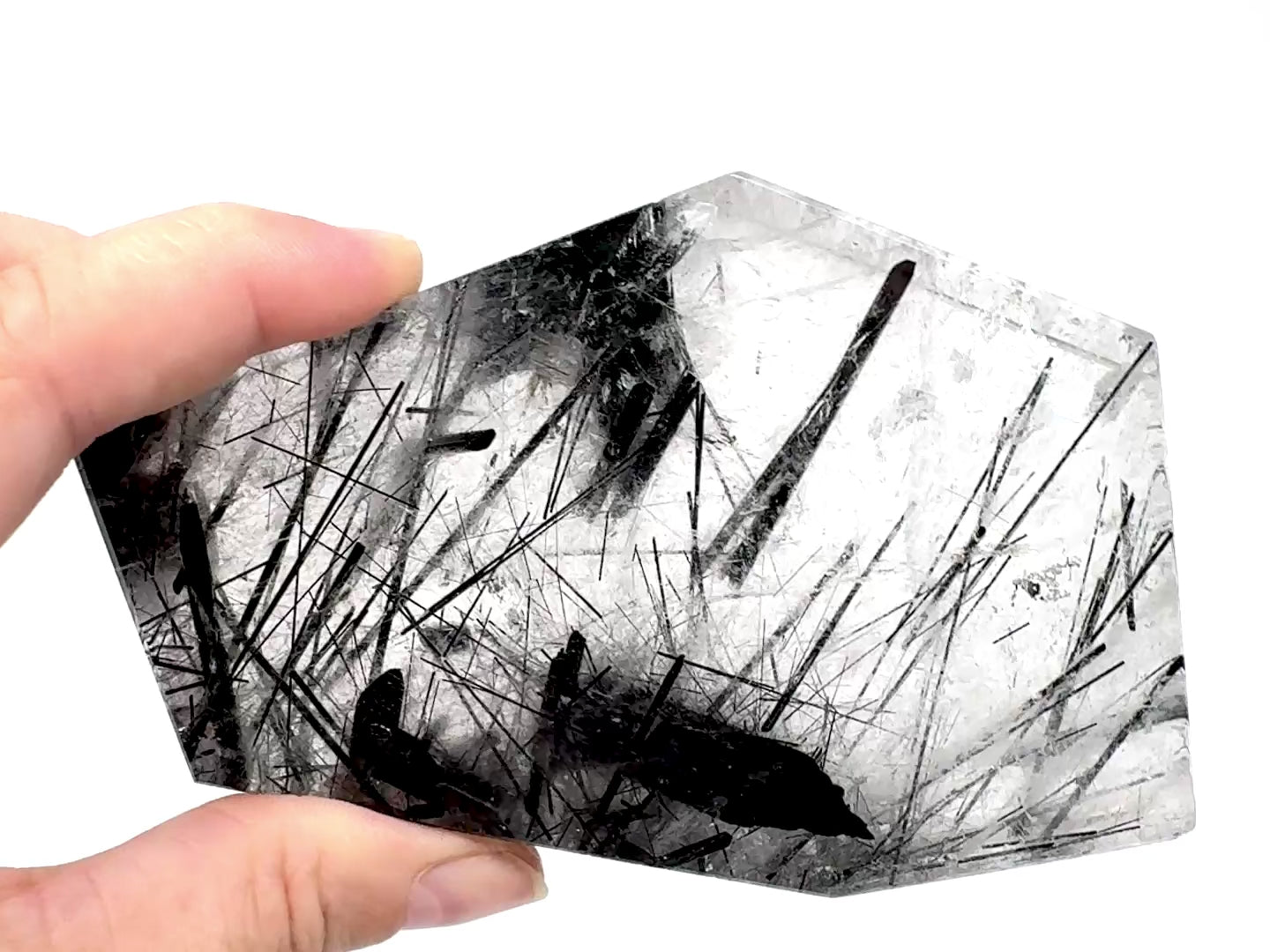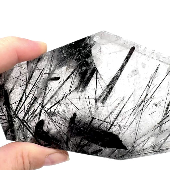 When the Quartz crystal was growing, or even before growth, minerals (in this case, Black Tourmaline) grew to be surrounded by the Clear Quartz. These minerals, which are sometimes too delicate to survive unprotected, were consequently protected by the Quartz. The clarity of the Quartz crystal provides a window through which to view the Black Tourmaline inclusions that it protects.
