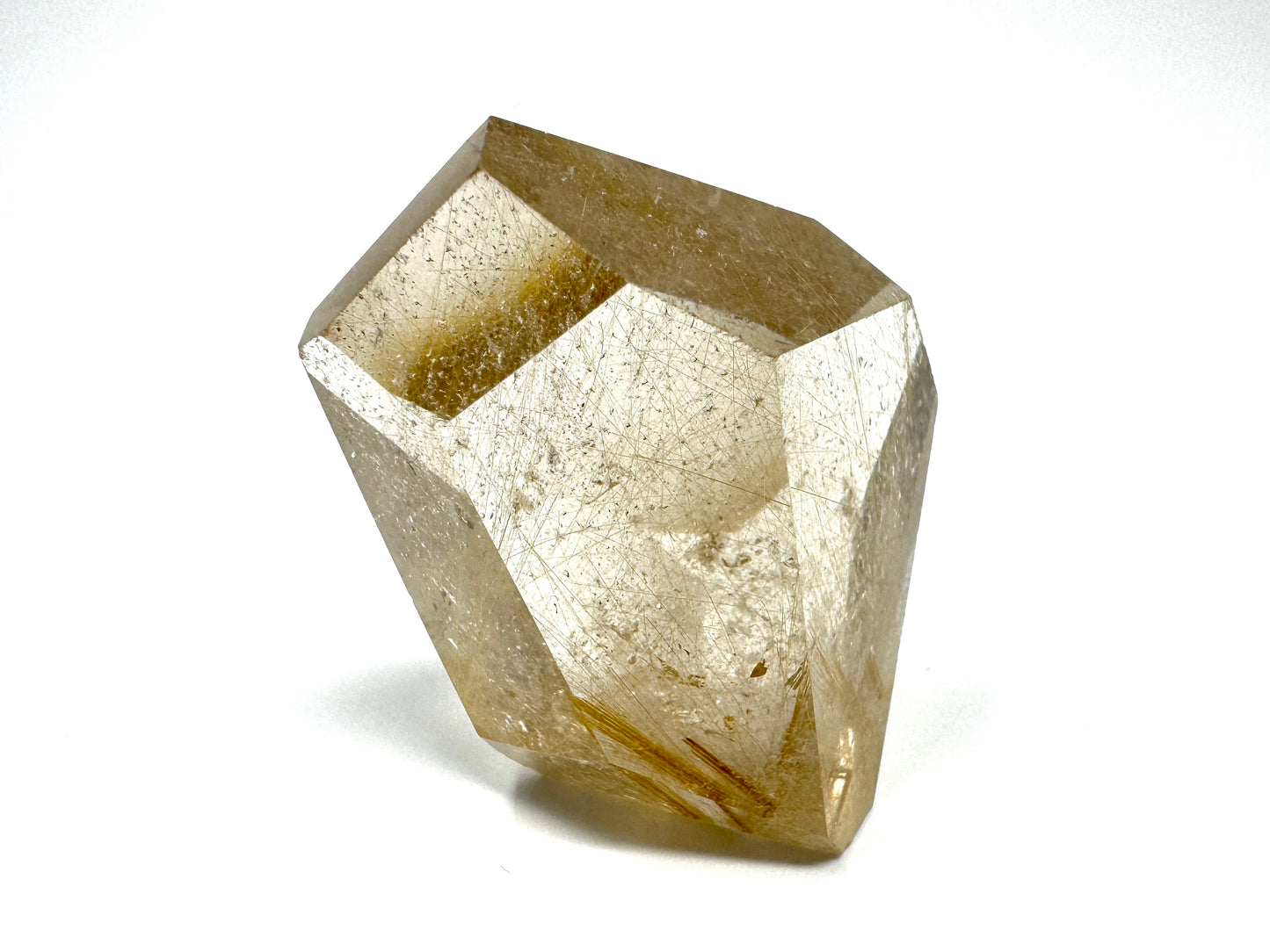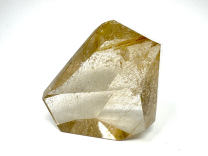 The natural Rutilated Quartz Stone has been carefully cut and polished into a faceted crystal shape that displays multiple polished faces.
