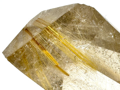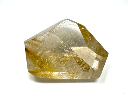 This gorgeous, polished Faceted Rutilated Quartz Crystal measuring 4.4cm long is bright and vibrant, displaying shimmering golden rutile inclusions.