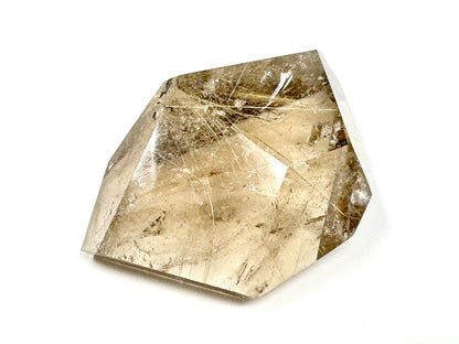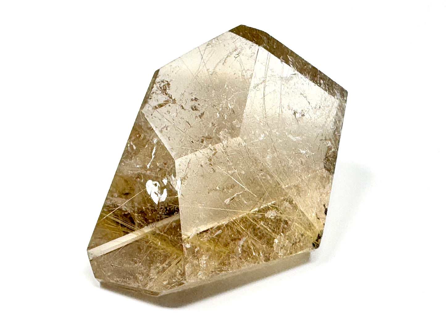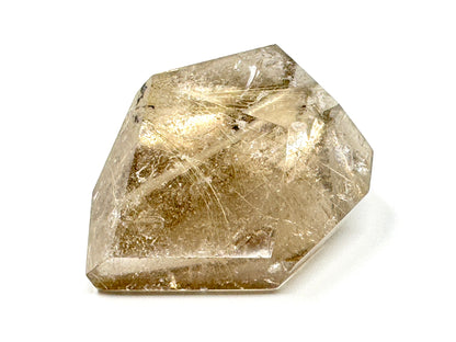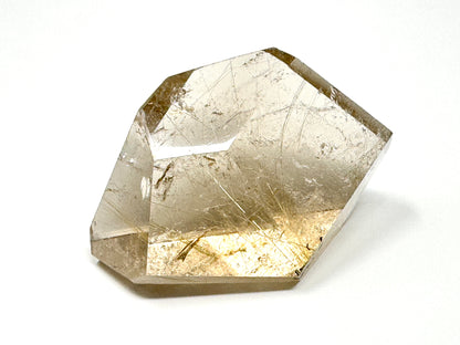 This gorgeous, polished Faceted Rutilated Quartz Crystal measuring 5.7cm long is bright and vibrant, displaying shimmering golden rutile inclusions.