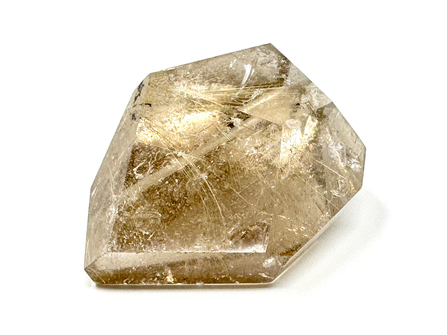 The natural Rutilated Quartz Stone has been carefully cut and polished into a faceted crystal shape that displays multiple polished faces.