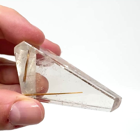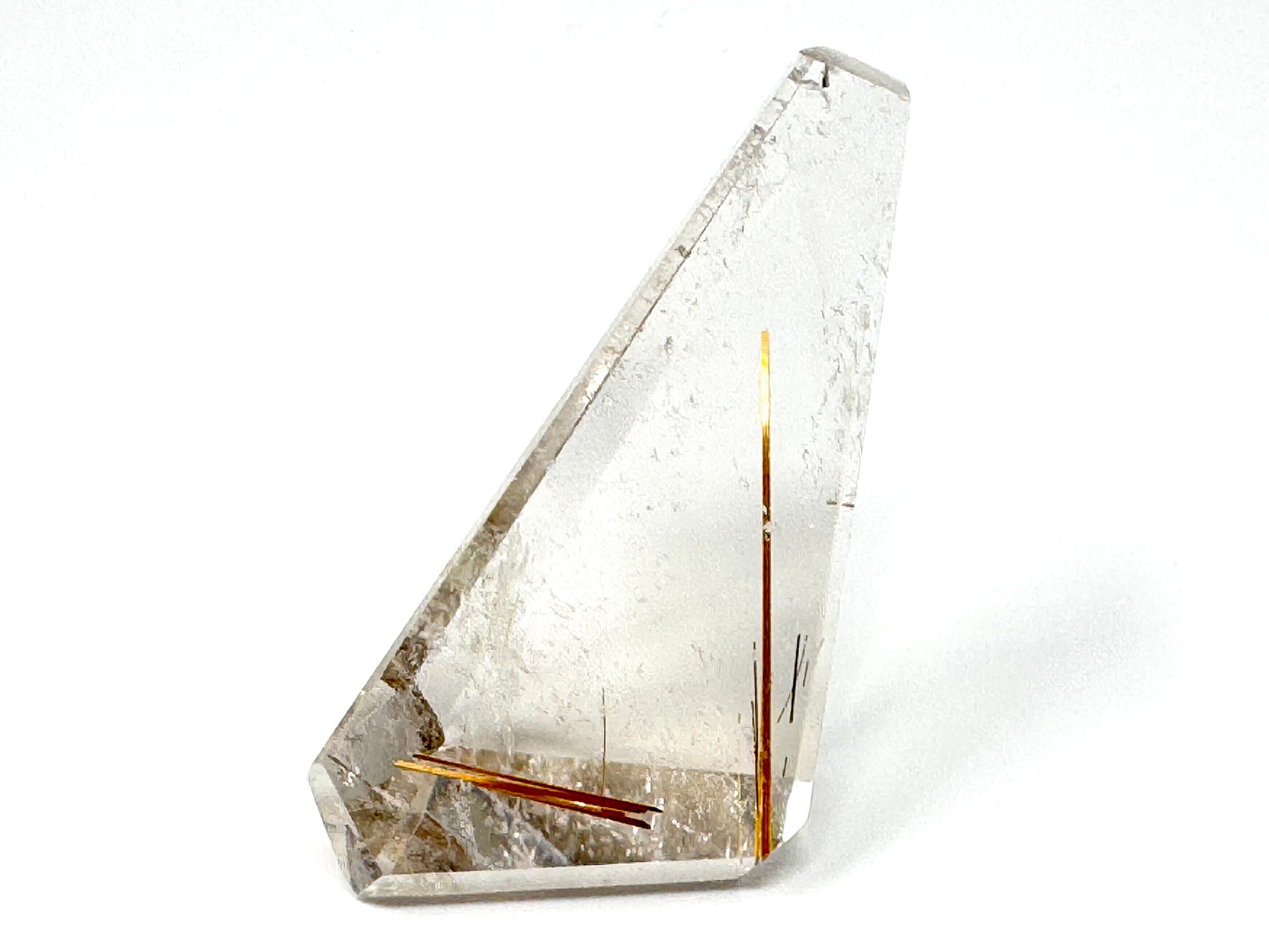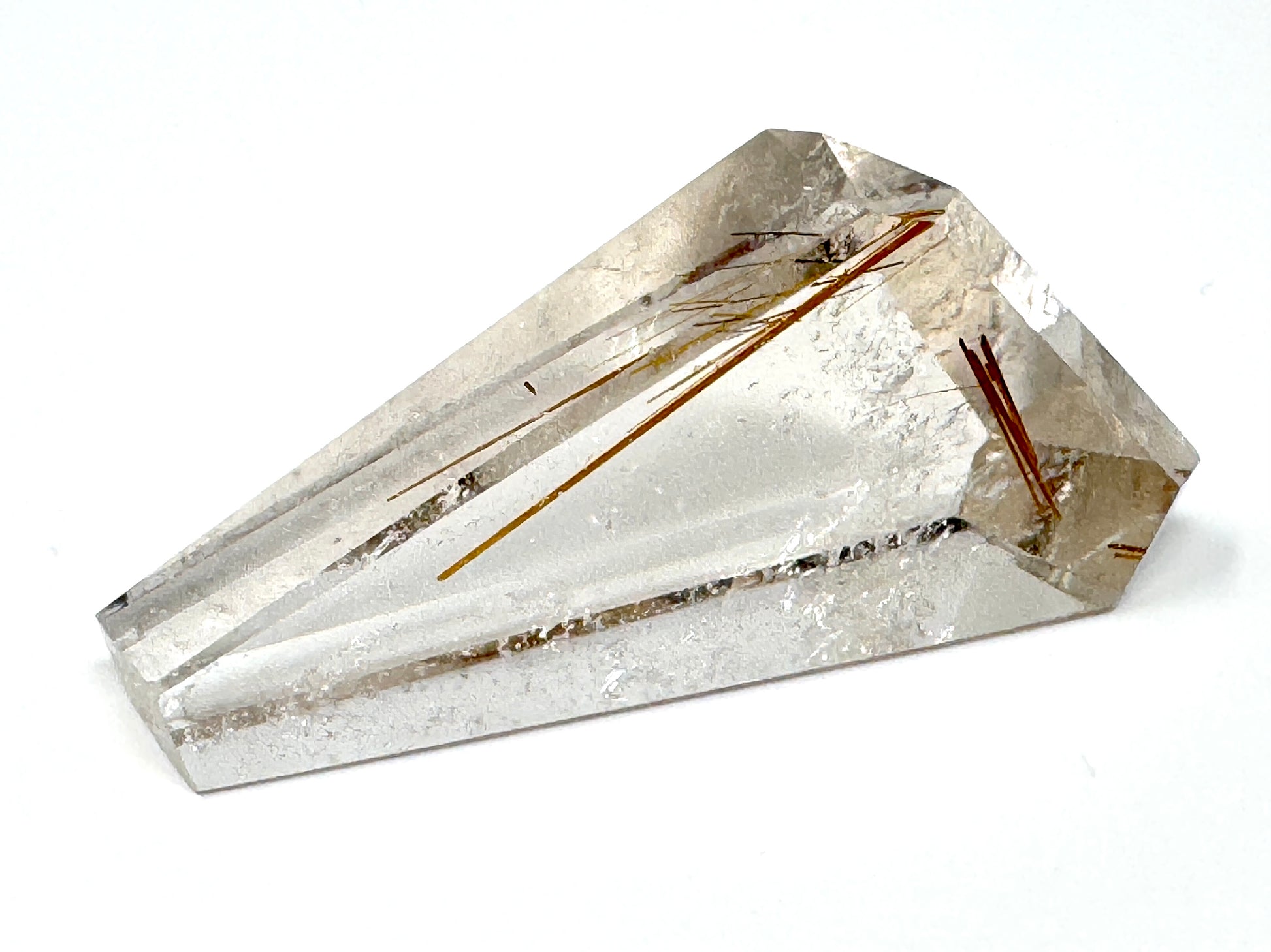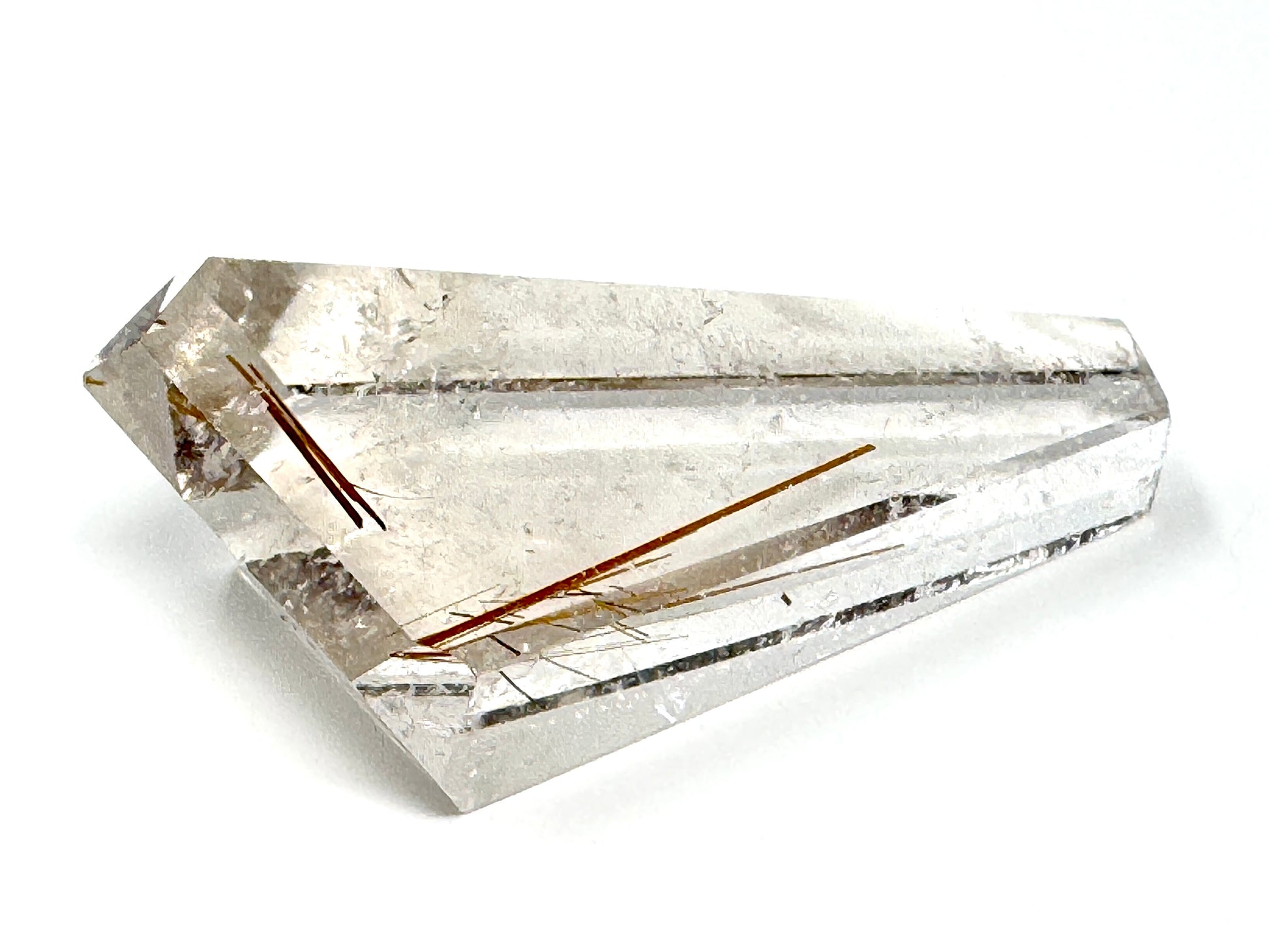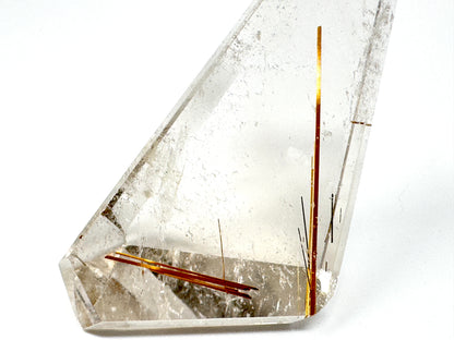 The natural Rutilated Quartz Stone has been carefully cut and polished into a faceted crystal shape that displays multiple polished faces.