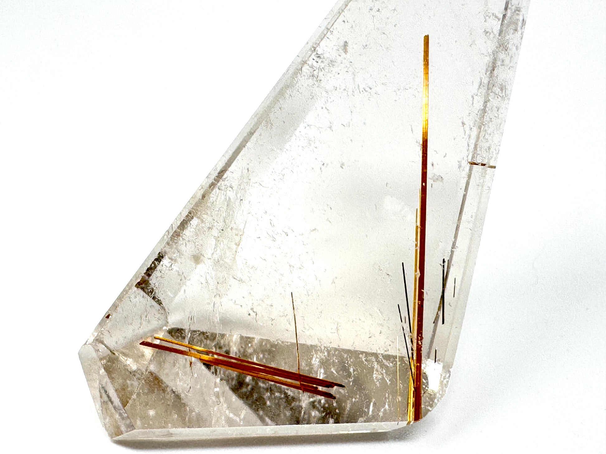 The high polish has enhanced the clarity of the Quartz and the striking contrast between the sharp, straight rutile needles and the spectacular transparent backdrop.