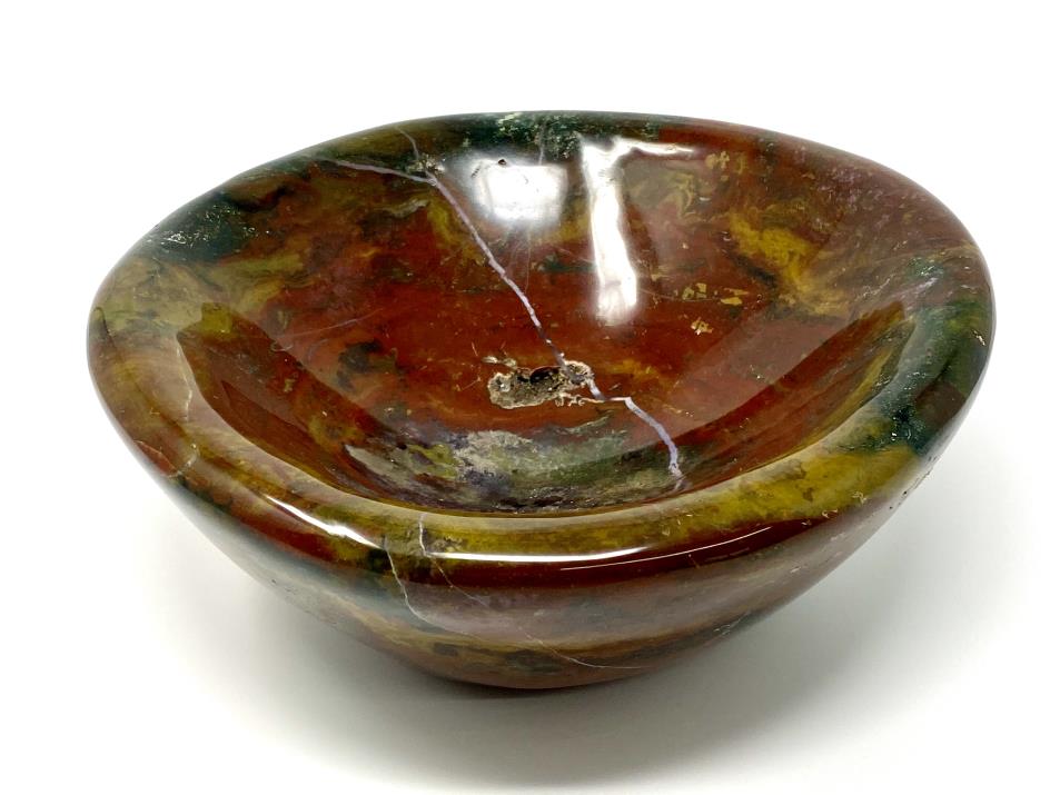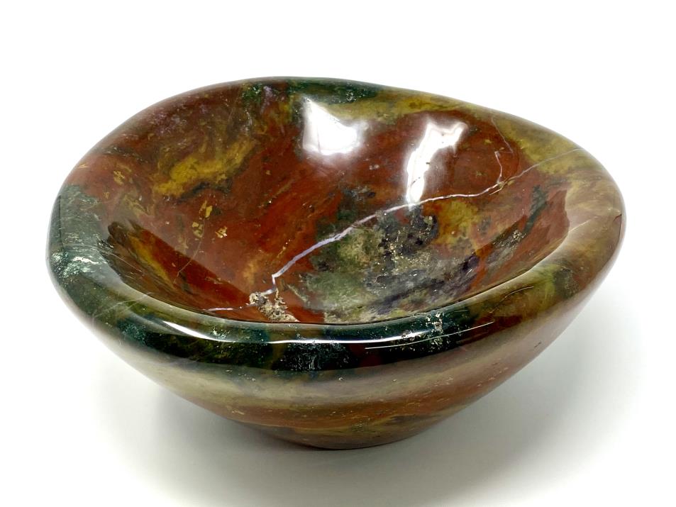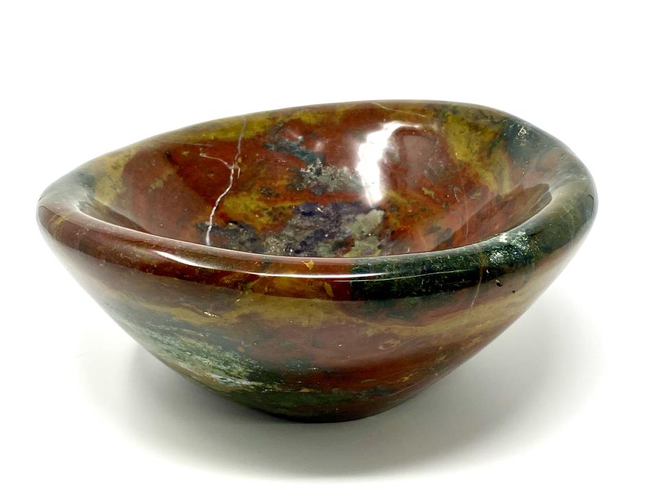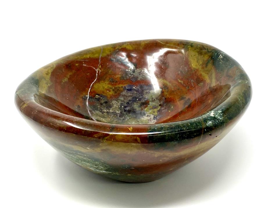 This Large Rainbow Jasper Crystal Bowl displays gorgeous swirls and orbs in colours ranging from deep oranges, rich reds, caramel-browns, and dark leafy greens.