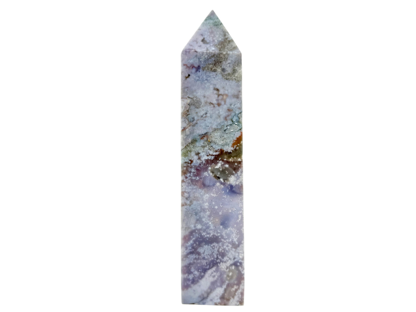 This Large Fancy Jasper Obelisk displays gorgeous swirls of colours in light, pastel colours and hues including stunning greys, purple-greys, and light lilacs.