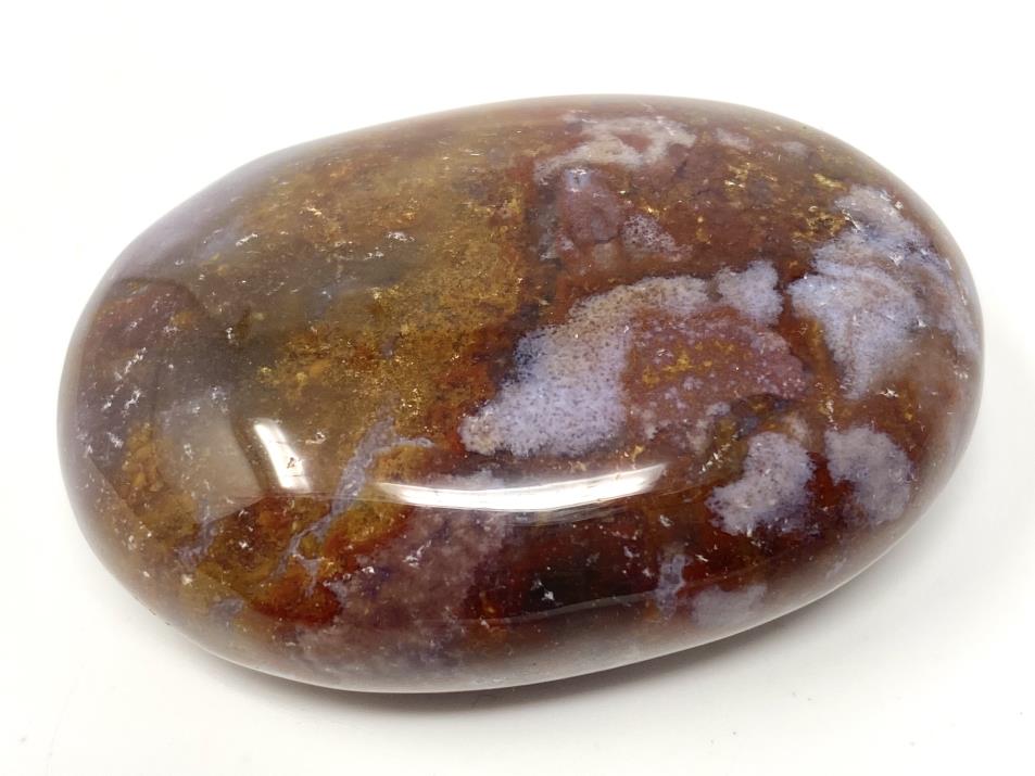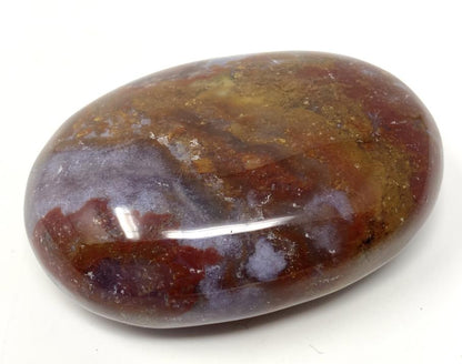 This Fancy Jasper Palm Stone displays gorgeous swirls of colours ranging from burnt oranges, caramel-browns, beiges and chocolate browns to mustard yellows, dark leafy greens, and rich reds, alongside subtle lilac purple-greys.