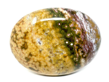 This Fancy Jasper Palm Stone displays gorgeous swirls of colours ranging from burnt oranges, caramel-browns, beiges and chocolate browns to mustard yellows, dark leafy greens, and rich reds.