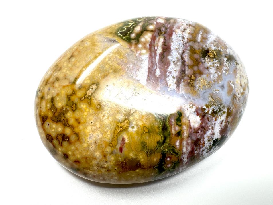 This highly polished Fancy Jasper Pebble measuring 6.4cm long displays a unique pattern of stunning rainbow colours.