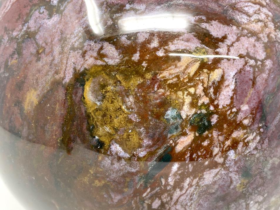This Large Rainbow Jasper Crystal Sphere displays gorgeous swirls and orbs in colours ranging from deep oranges, rich reds, caramel-browns, and dark leafy greens.
