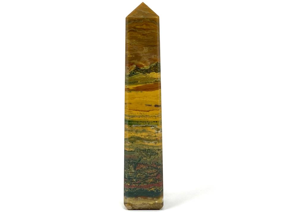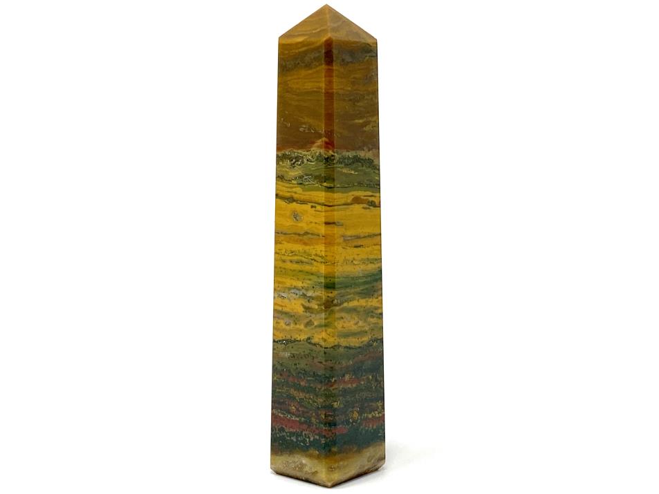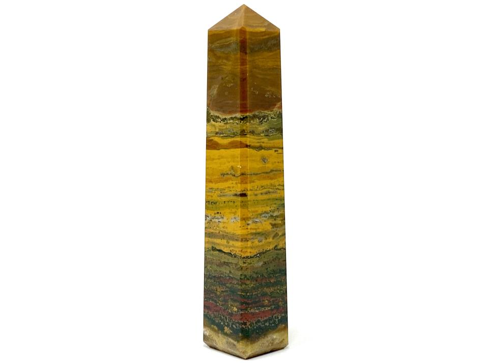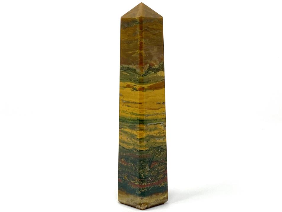 This highly polished Fancy Jasper Tower measuring 11.8cm tall displays a unique pattern of stunning rainbow colours.