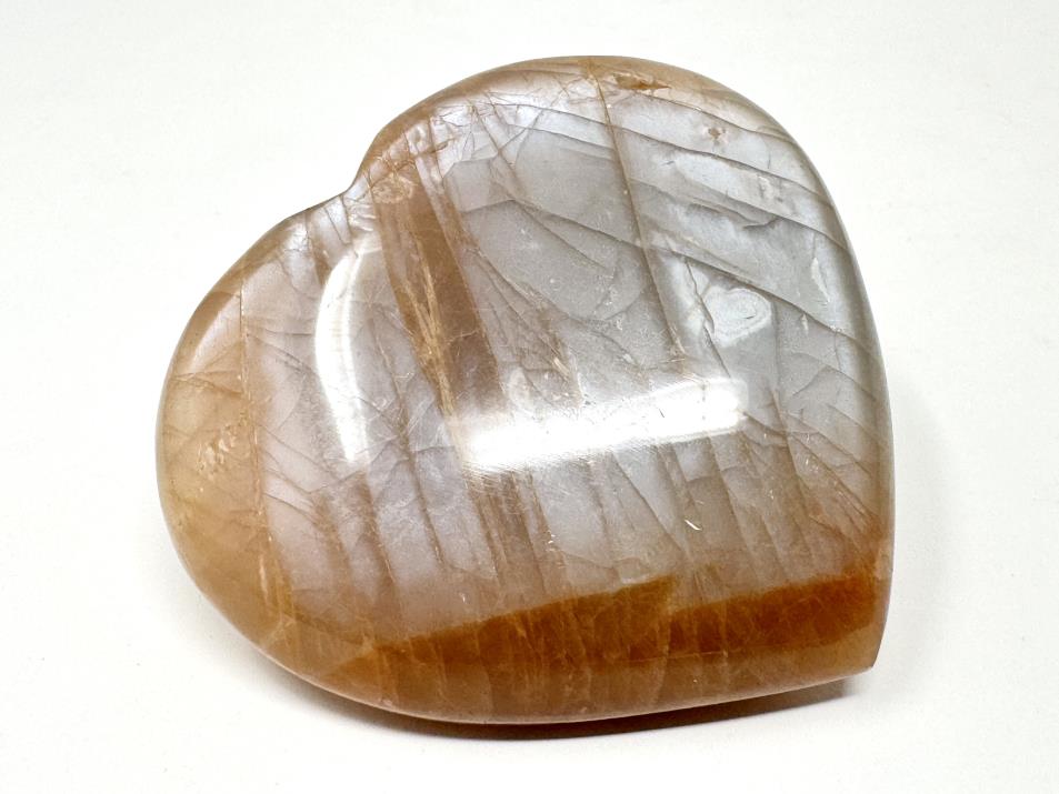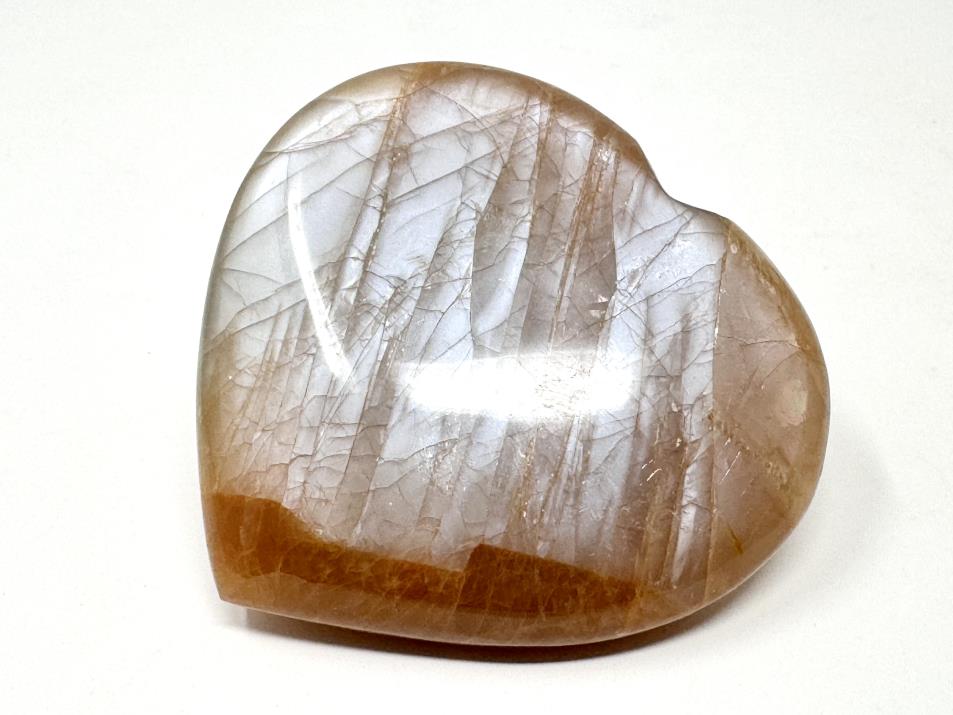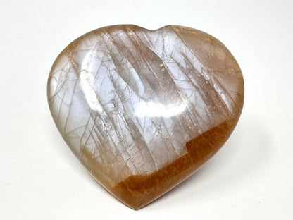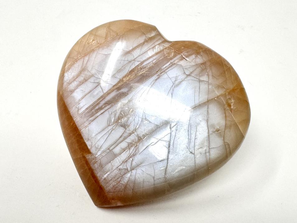 This gorgeous Flashy Peach Moonstone Heart Crystal measures 6.8cm wide and displays beautiful tan, orange, and pink-peach hues with a stunning silvery-blue shimmer and flash owing to its Feldspar composition.