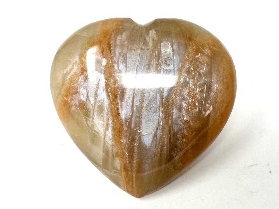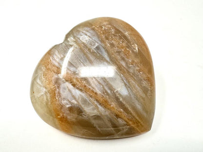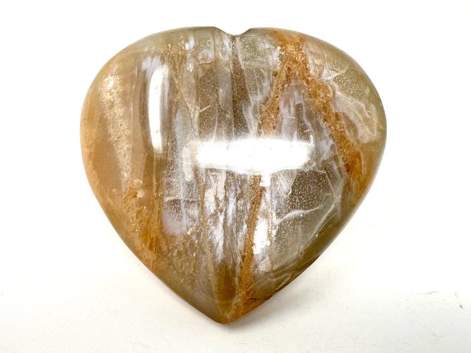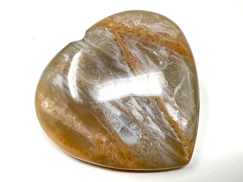 This gorgeous Flashy Peach Moonstone Heart Crystal measures 6cm wide and displays beautiful tan, orange, and pink-peach hues with a stunning silvery-blue shimmer and flash owing to its Feldspar composition.