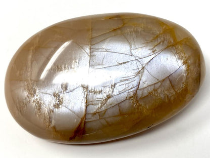 This gorgeous Flashy Peach Moonstone Pebble (otherwise known as a Flashy Peach Moonstone Palm Stone) measures 7.1cm long and displays beautiful tan, orange, and pink-peach hues with a stunning silvery-blue shimmer and flash owing to its Feldspar composition.