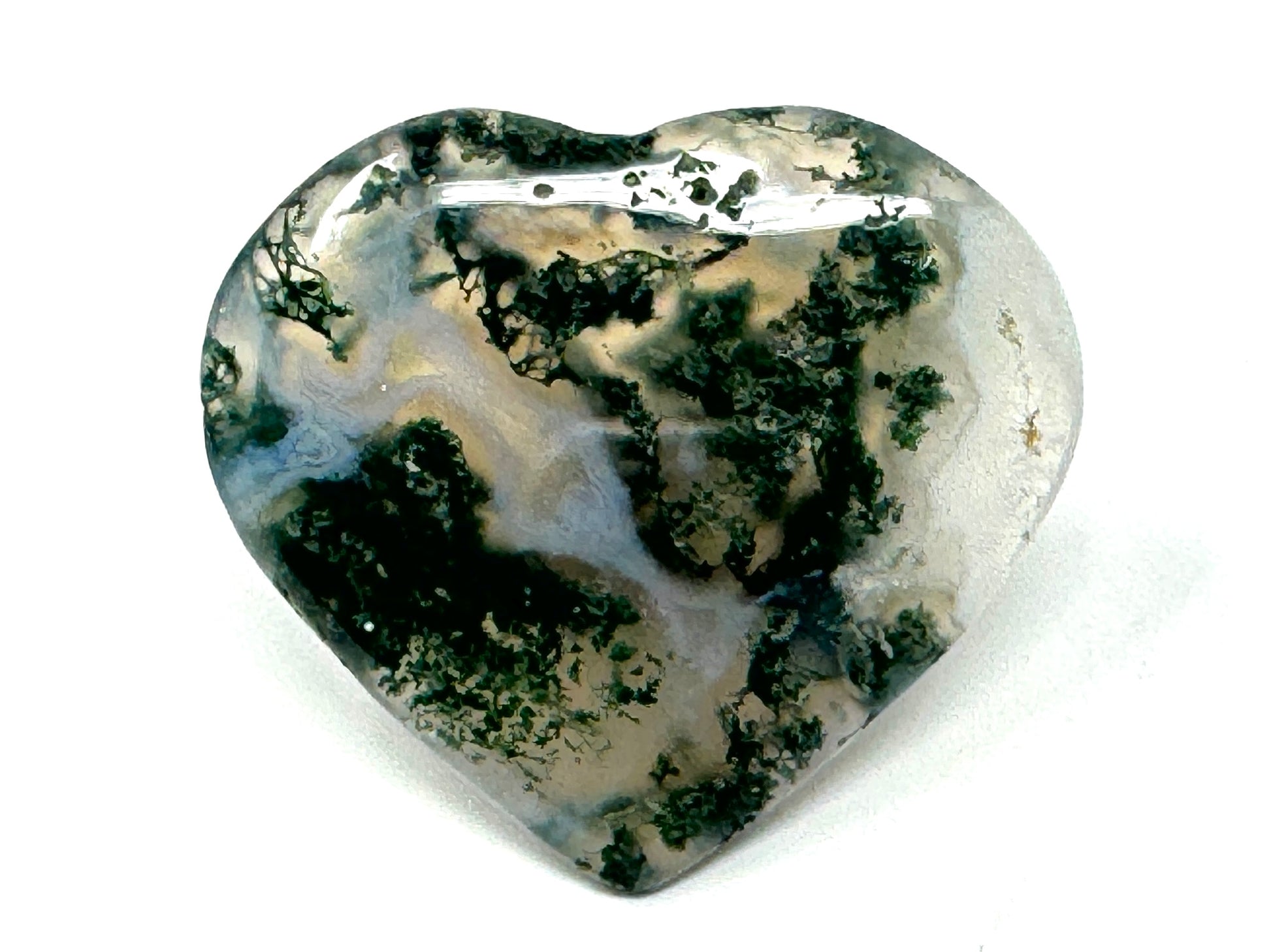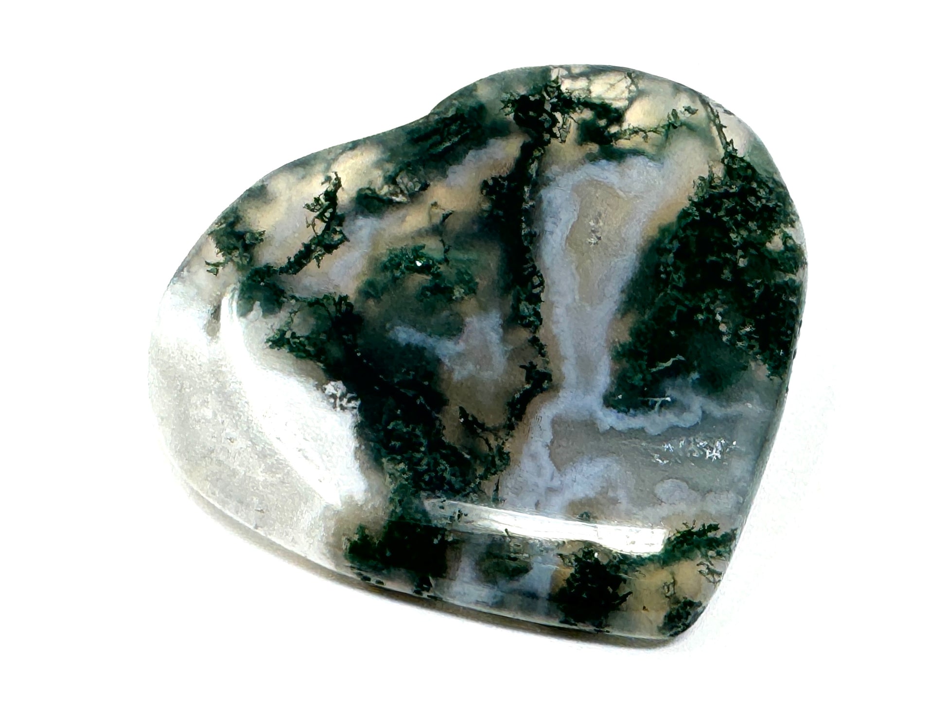 This Moss Agate Heart showcases stunning milky White Quartz/ White Agate adorned with dark and verdant green tree-like, moss-like dendritic patterns.