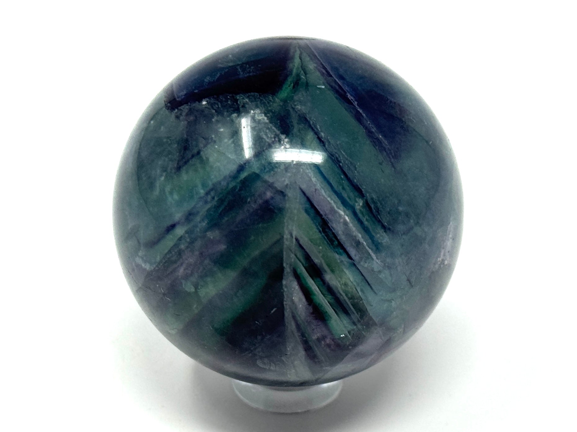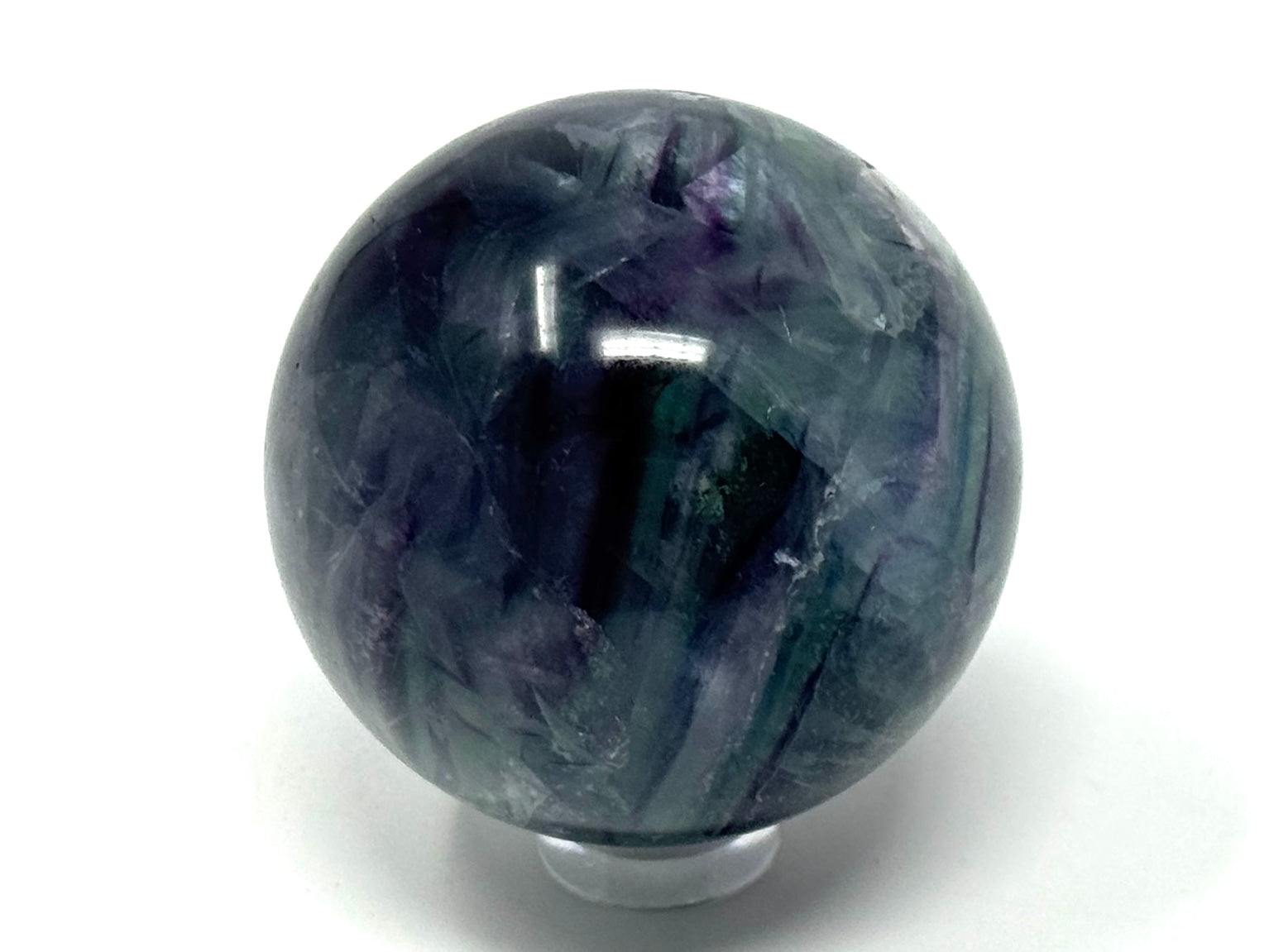 This beautiful 4.7cm wide beautiful Fluorite Sphere showcases leafy green hues contrasted against rich purples and blues