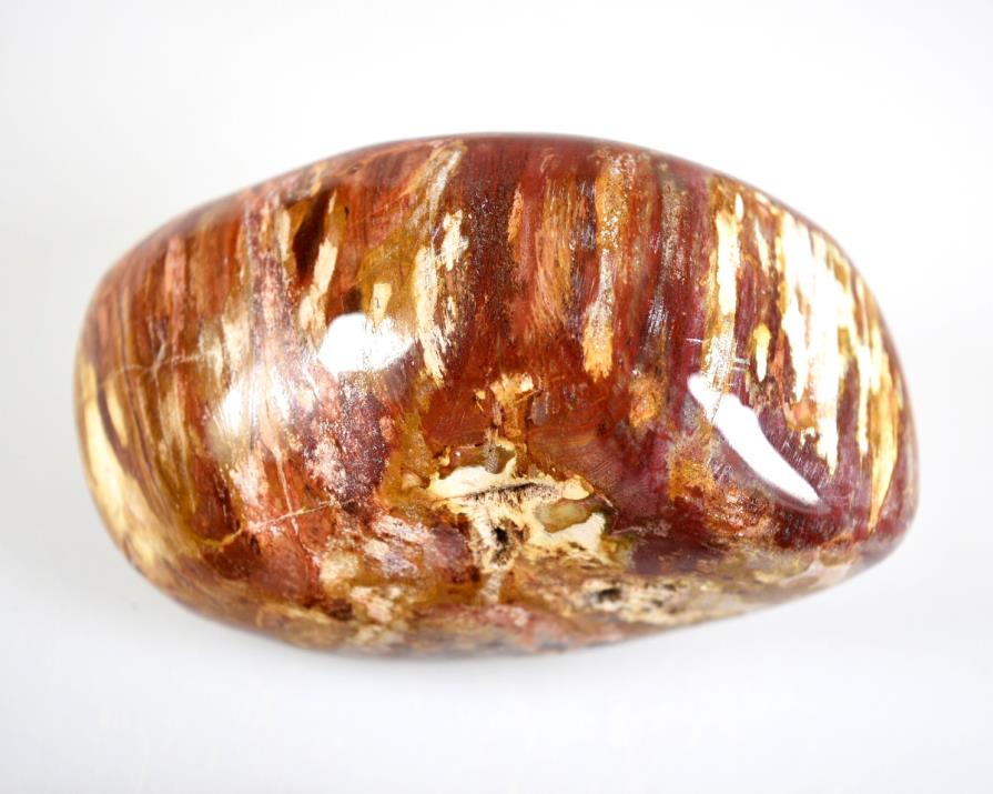 Fossil Wood Pebble from Madagascar. This fabulous hand polished pebble is 284grams it is chunky and very tactile. Fossil Wood or Petrified Wood is wood that has been replaced over millions of years by Quartz and Chalcedony minerals. The reds displayed in this pebble are from Jasper. The fossilised wood is Araucaria or Monkey Puzzle tree and it is Triassic 248 million years old.