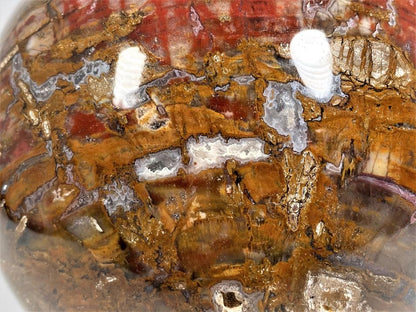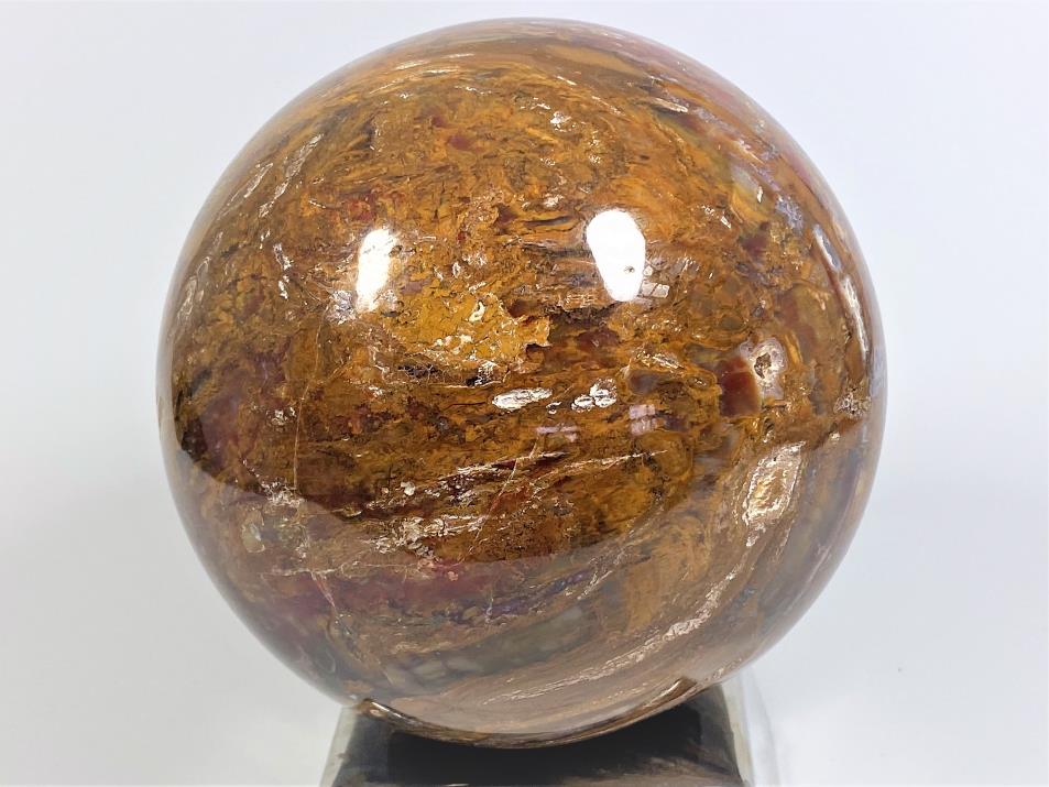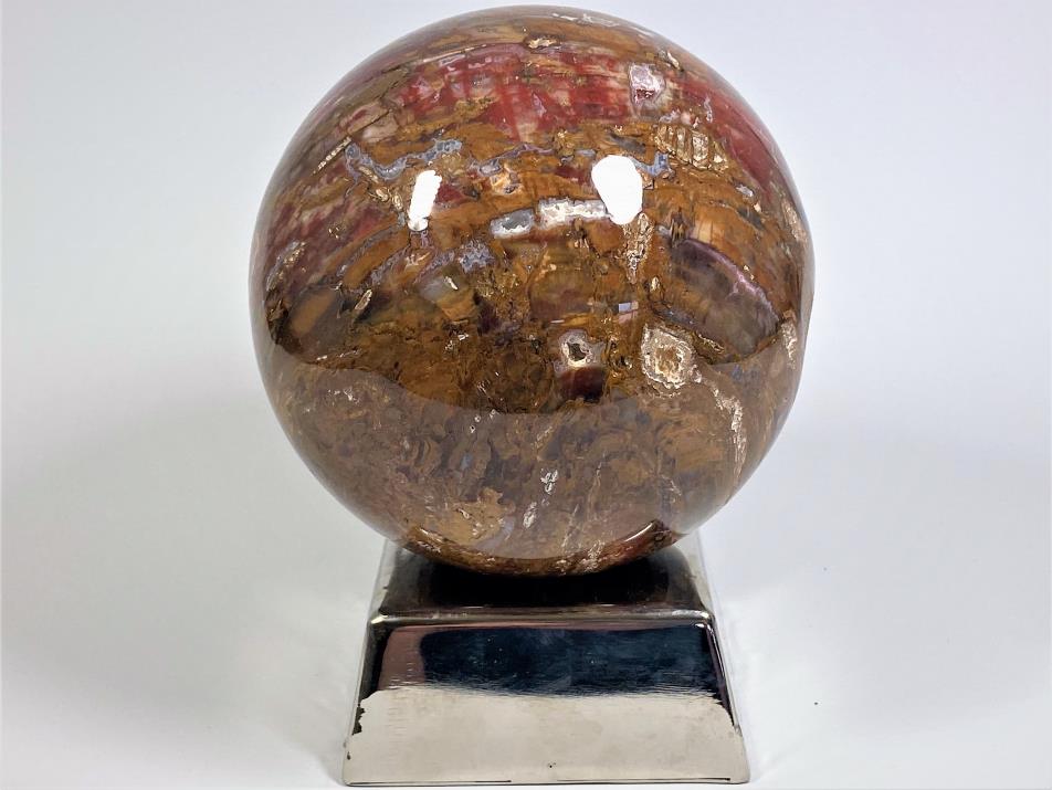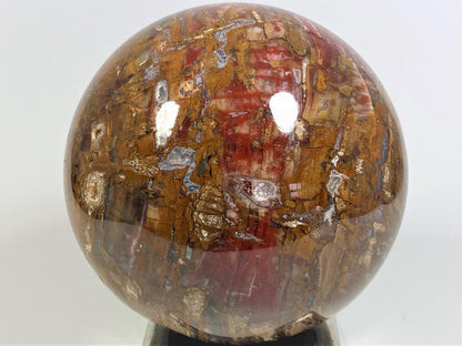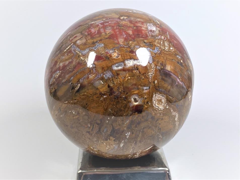 Fossil Wood Sphere, fossil and crystal for sale from India.This magnificent, large sphere measuring 13.1cm in diameter has been cut from a Fossil Wood log and polished to reveal the vividly coloured Jaspers which have replaced the original wood very slowly in the process of silicification. We have just received a new, unique batch of Fossil Wood sourced from Madhya Pradesh in India, where it is sometimes referred to as 'Trees of Stone'. This rare wood has been beautifully polished to a high standard during its preparation in our Indian workshop.