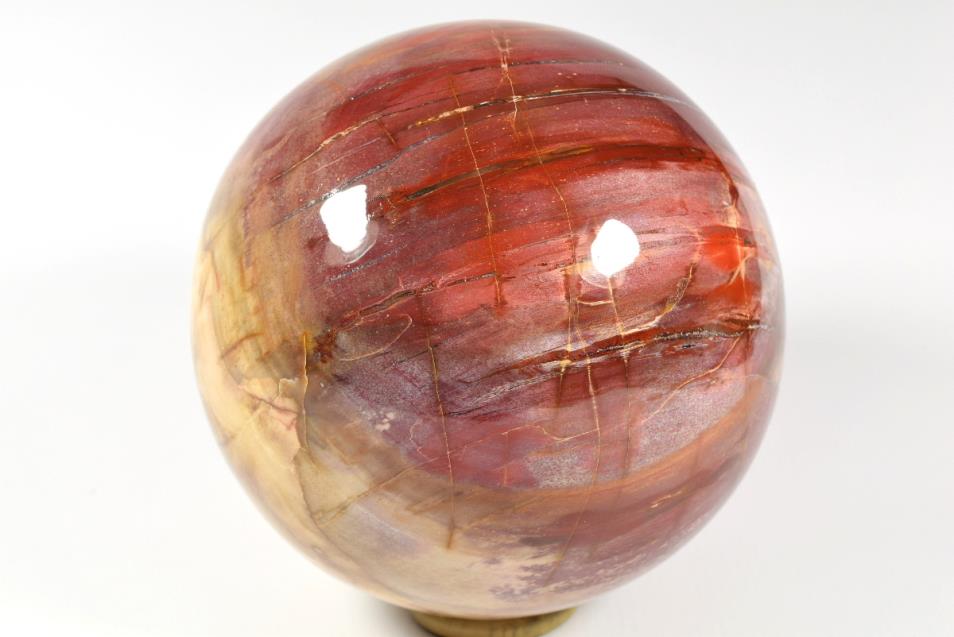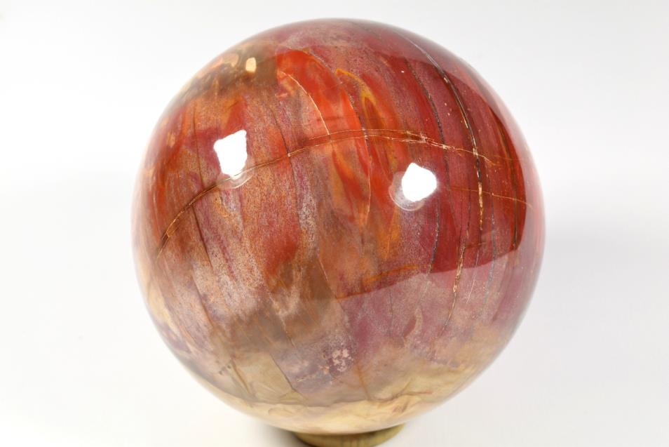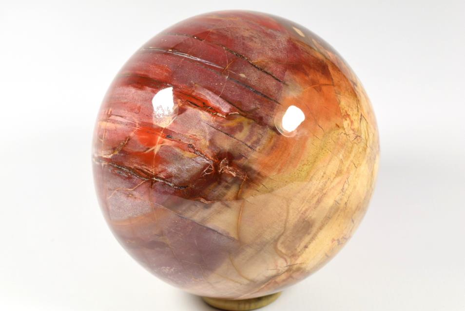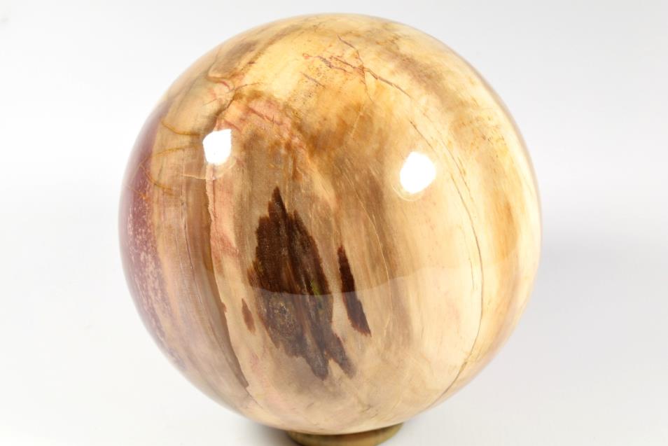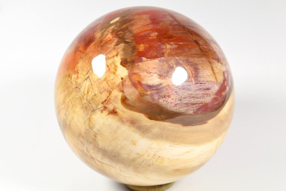 Fossil Wood Sphere Large from Madagascar. This large attractive Fossil Wood Sphere is 14.5cm diameter it displays beautiful rich colours. Fossil Wood or Petrified Wood is wood that has been replaced over millions of years by Quartz and Chalcedony minerals. The reds displayed in this Sphere are from Jasper. The fossilised wood is Araucaria or Monkey Puzzle tree and it is Triassic 248 million years old.The sphere will come come with a highly polished stainless custom built stand.