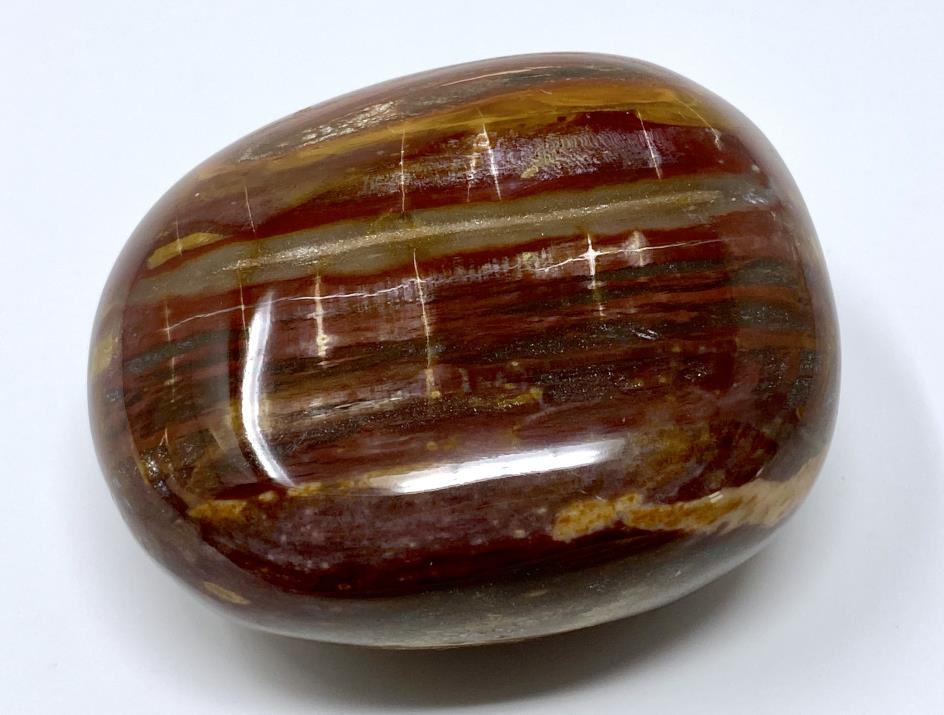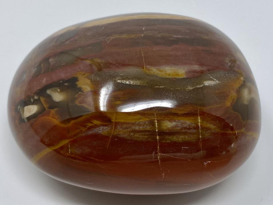 Fossil Wood Pebble, fossil and crystal for sale from Madagascar. This gorgeous 6.7cm long pebble is a section from a Fossil Wood log that has been polished to reveal the vividly coloured Jaspers which have replaced the original wood very slowly in the process of silicification.