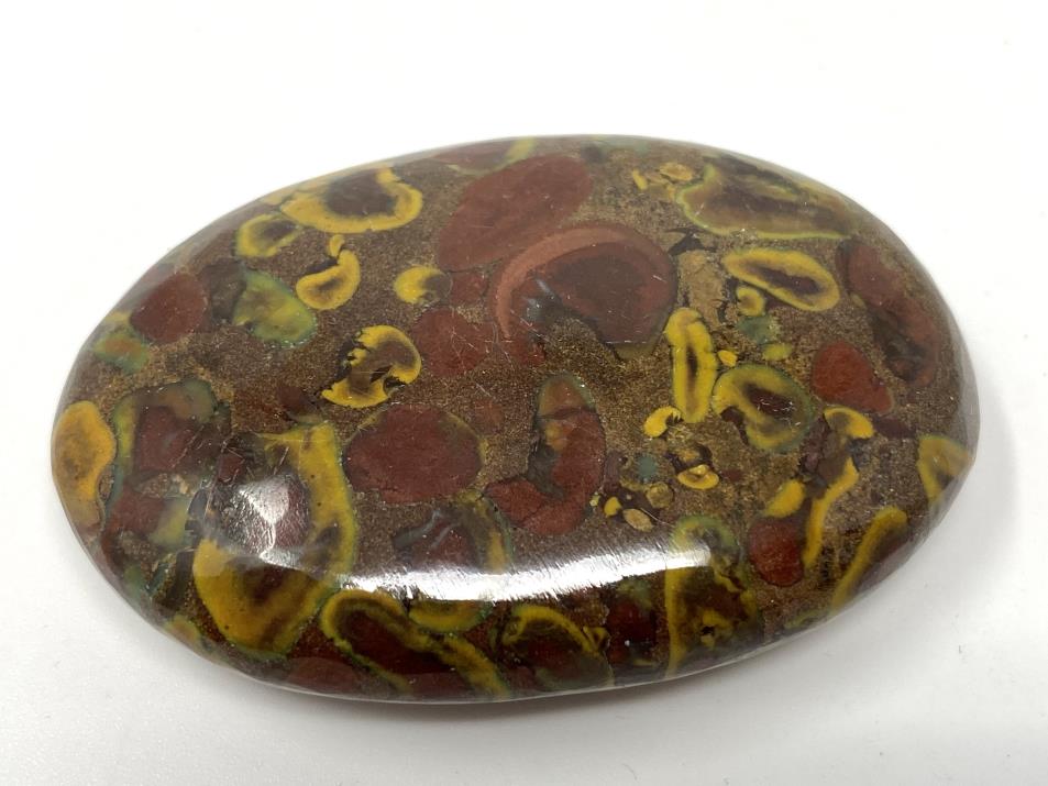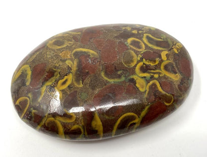 This stunning flat Fruit Jasper Crystal Pebble (also known as an Ajooba Jasper Crystal Pebble) measuring 5.8cm long has been cut into a flat oval palm stone shape and beautifully polished to show off its vast array of colours and patterns that lend individuality to each selected piece.