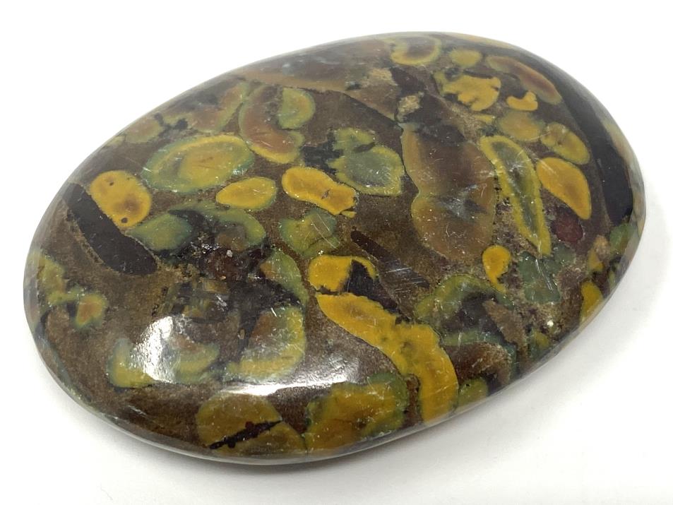 This stunning flat Fruit Jasper Crystal Pebble (also known as an Ajooba Jasper Crystal Pebble) measuring 6.1cm long has been cut into a flat oval palm stone shape and beautifully polished to show off its vast array of colours and patterns that lend individuality to each selected piece.