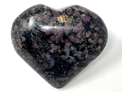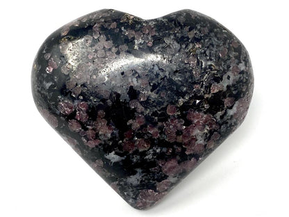 This gorgeous Garnet in Black Tourmaline Heart measuring 6.1cm wide is a stunning black crystal with striking circular red Garnet inclusions.