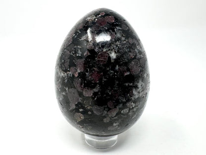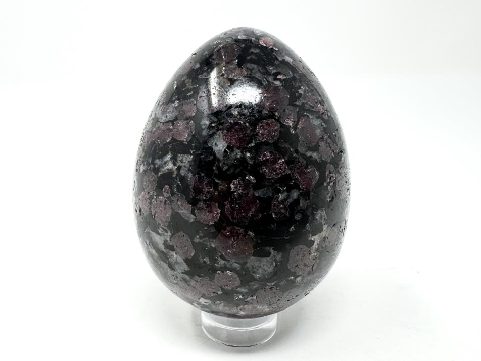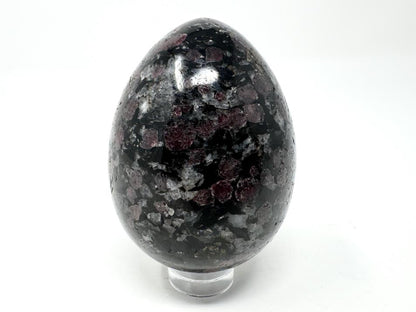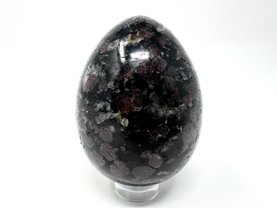 This gorgeous Garnet in Black Tourmaline Egg measuring 5.5cm tall is a stunning black crystal with striking circular red Garnet inclusions.