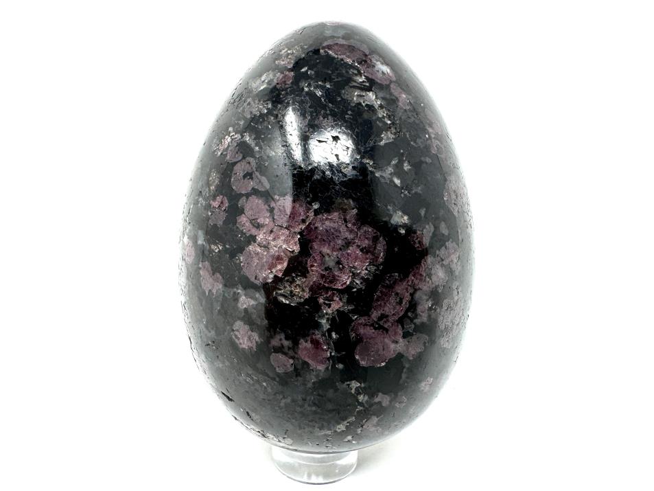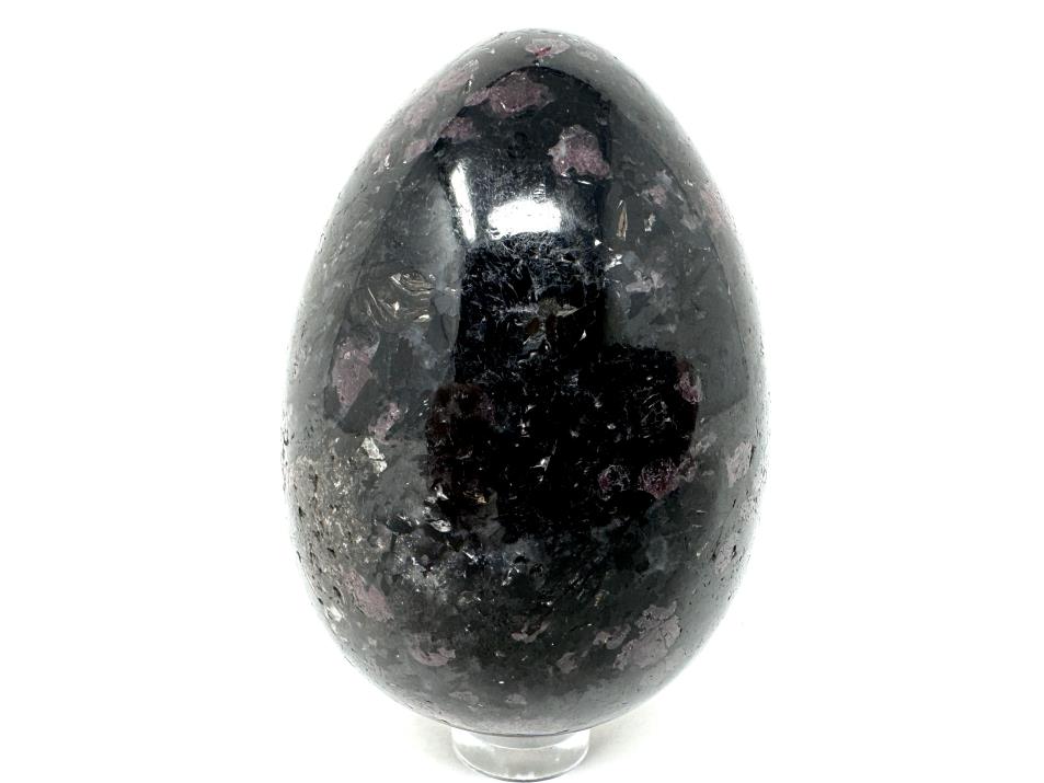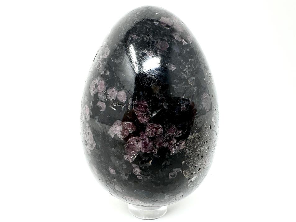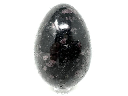This gorgeous Garnet in Black Tourmaline Egg measuring 7.2cm tall is a stunning black crystal with striking circular red Garnet inclusions.