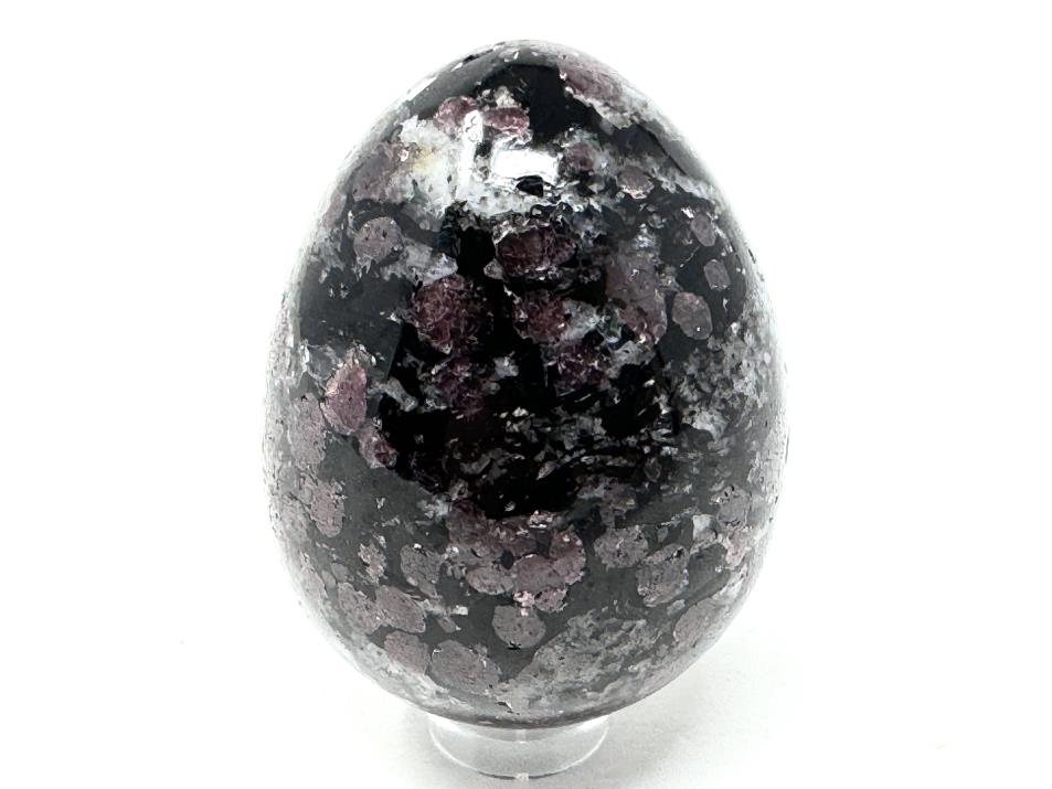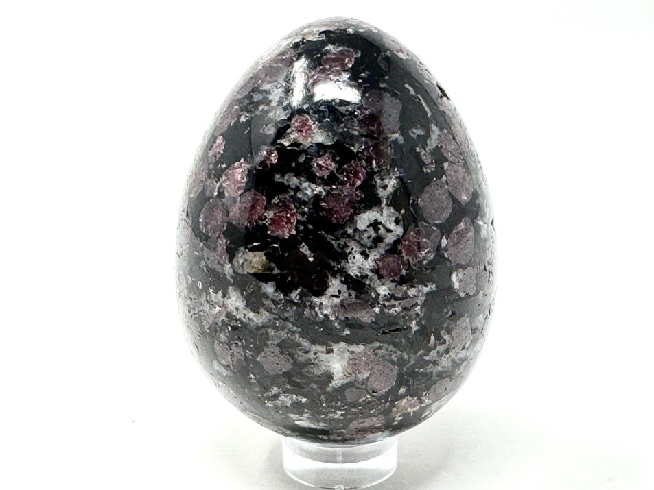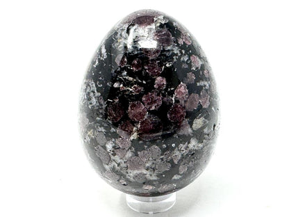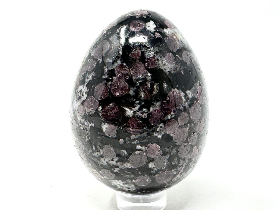 This gorgeous Garnet in Black Tourmaline Egg measuring 5.6cm tall is a stunning black crystal with striking circular red Garnet inclusions.