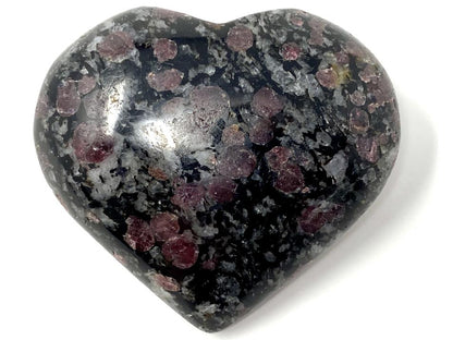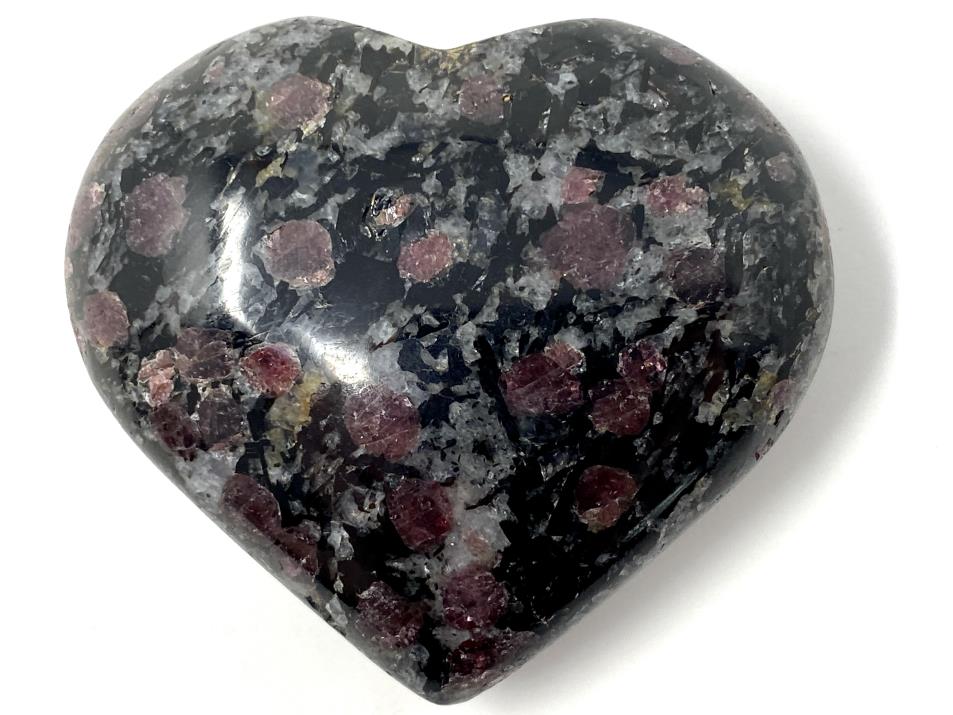 This gorgeous Garnet in Black Tourmaline Heart measuring 5.9cm wide is a stunning black crystal with striking circular red Garnet inclusions.