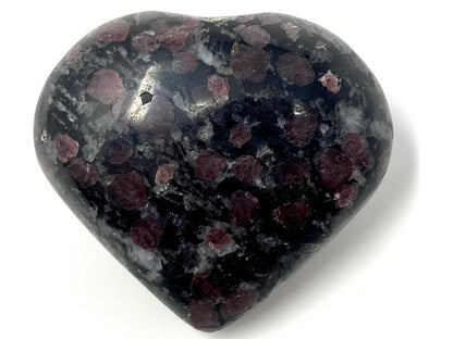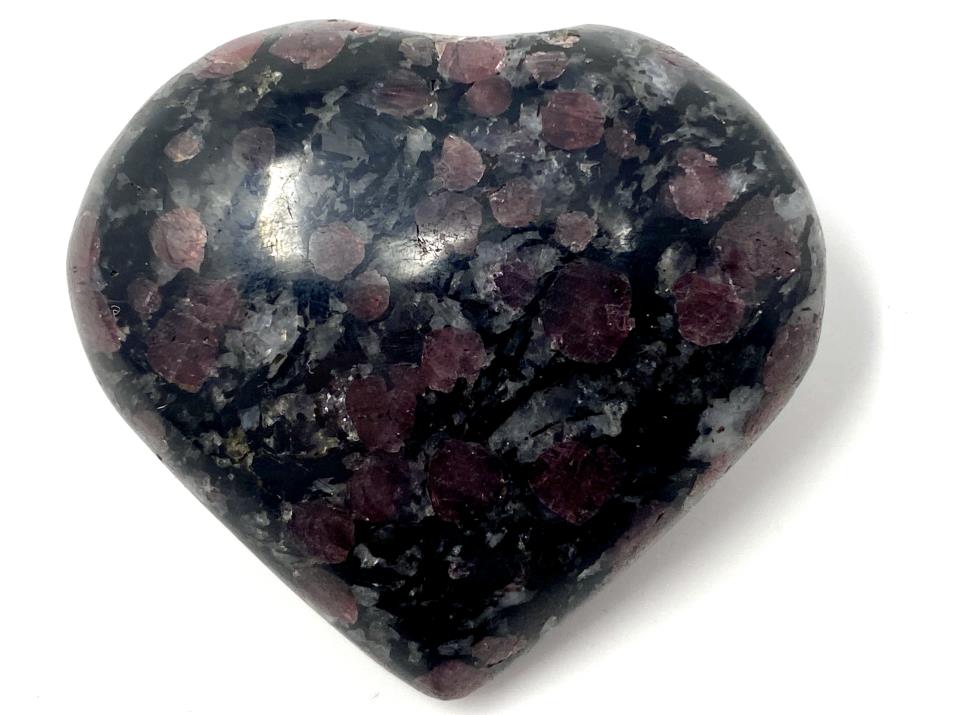 This gorgeous Garnet in Black Tourmaline Heart measuring 5.5cm wide is a stunning black crystal with striking circular red Garnet inclusions.