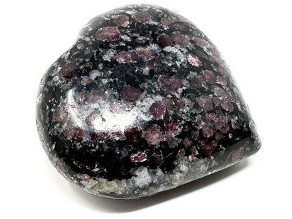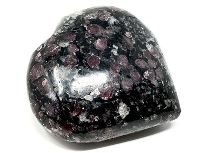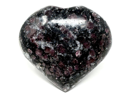 This gorgeous Garnet in Black Tourmaline Heart measuring 5.6cm wide is a stunning black crystal with striking circular red Garnet inclusions.