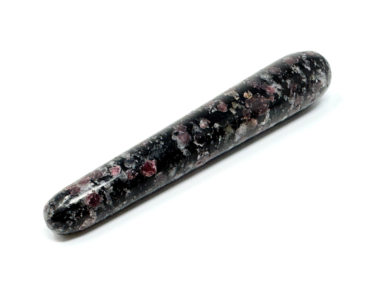 This gorgeous Garnet in Black Tourmaline Massage Wand (otherwise known as a Garnet in Black Tourmaline Crystal Wand) measuring 12.4cm long is a stunning black crystal with striking circular red Garnet inclusions.