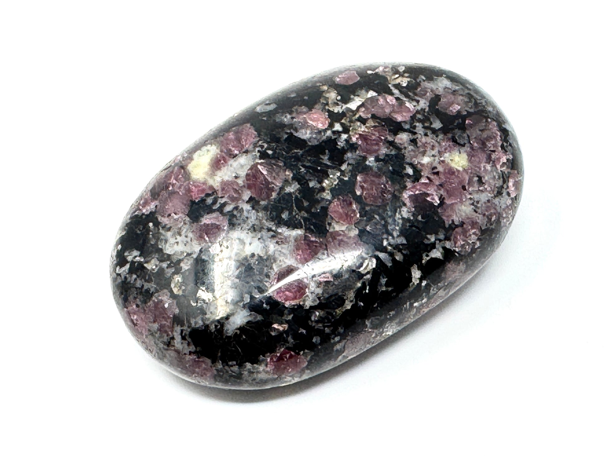 This gorgeous Garnet in Black Tourmaline Pebble (oval-shaped Garnet in Black Tourmaline Palm Stone) measuring 6.3cm long is a stunning black crystal with striking circular red Garnet inclusions.