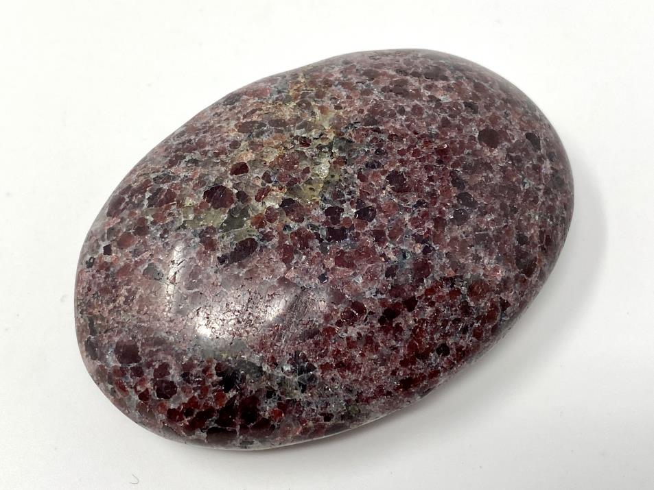 This Garnet Pebble (also known as a Garnet Palm Stone) has been polished to give a smooth, even finish, with some small natural pits.