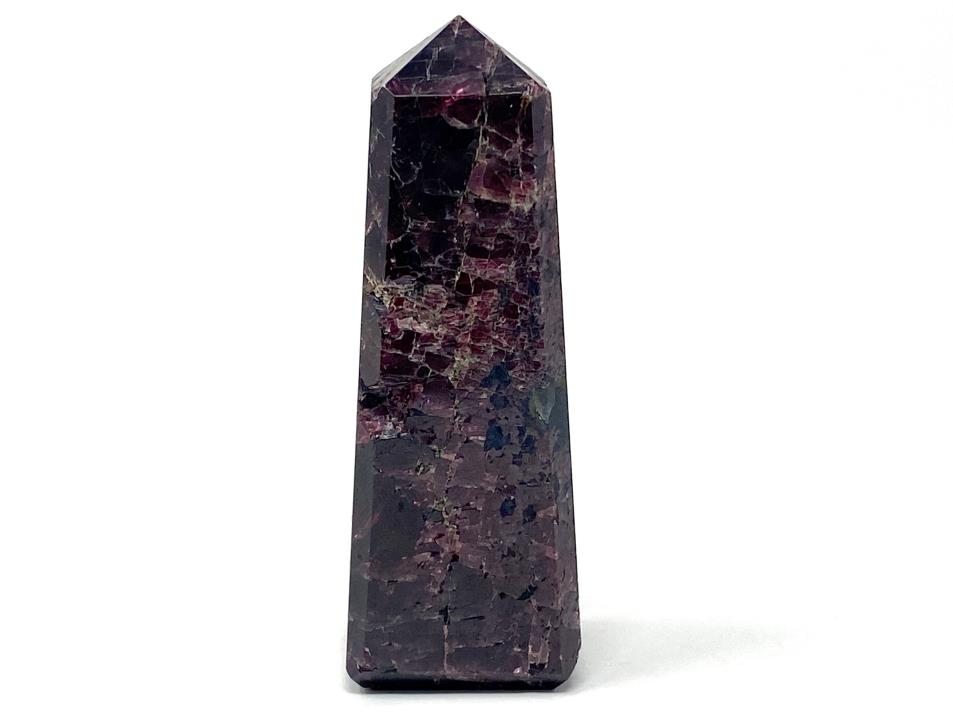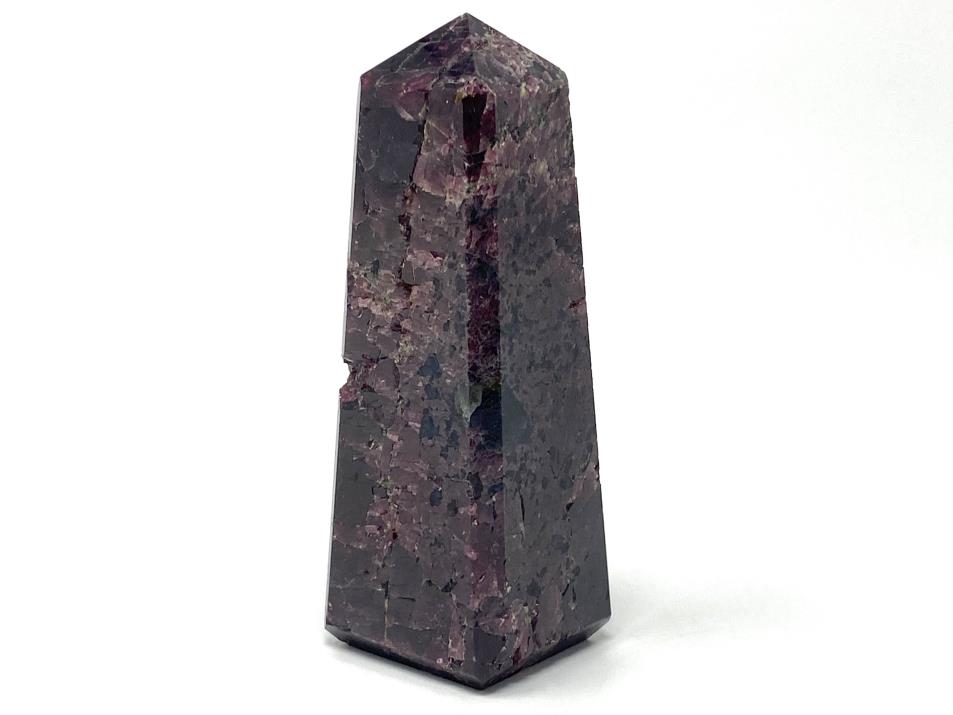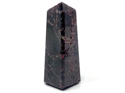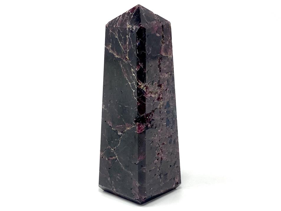 The Garnet Stone has been cut into a crystal tower/ obelisk shape, with a free-standing square-shaped base, four polished faces, and sharp pointed tip.