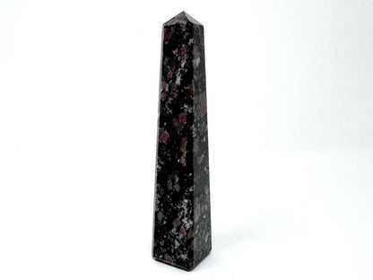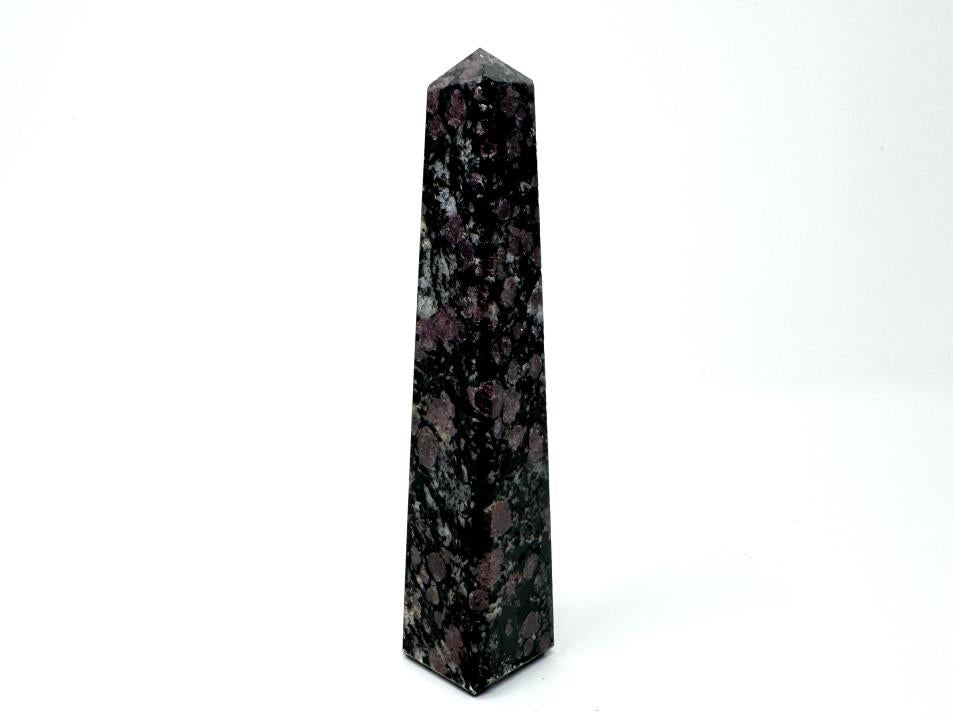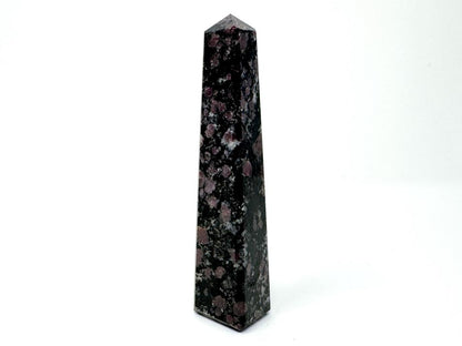 This gorgeous Garnet in Black Tourmaline Tower (free-standing Garnet in Black Tourmaline Obelisk) measuring 12.1cm tall is a stunning black crystal with striking circular red Garnet inclusions.