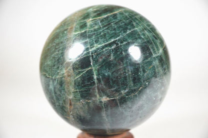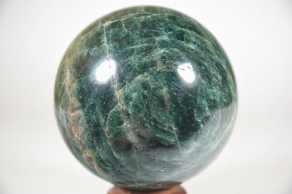 This gorgeous Green Apatite Crystal Sphere measures 7.8cm in diameter and displays emerald green hues which shimmer and sparkle in the light.