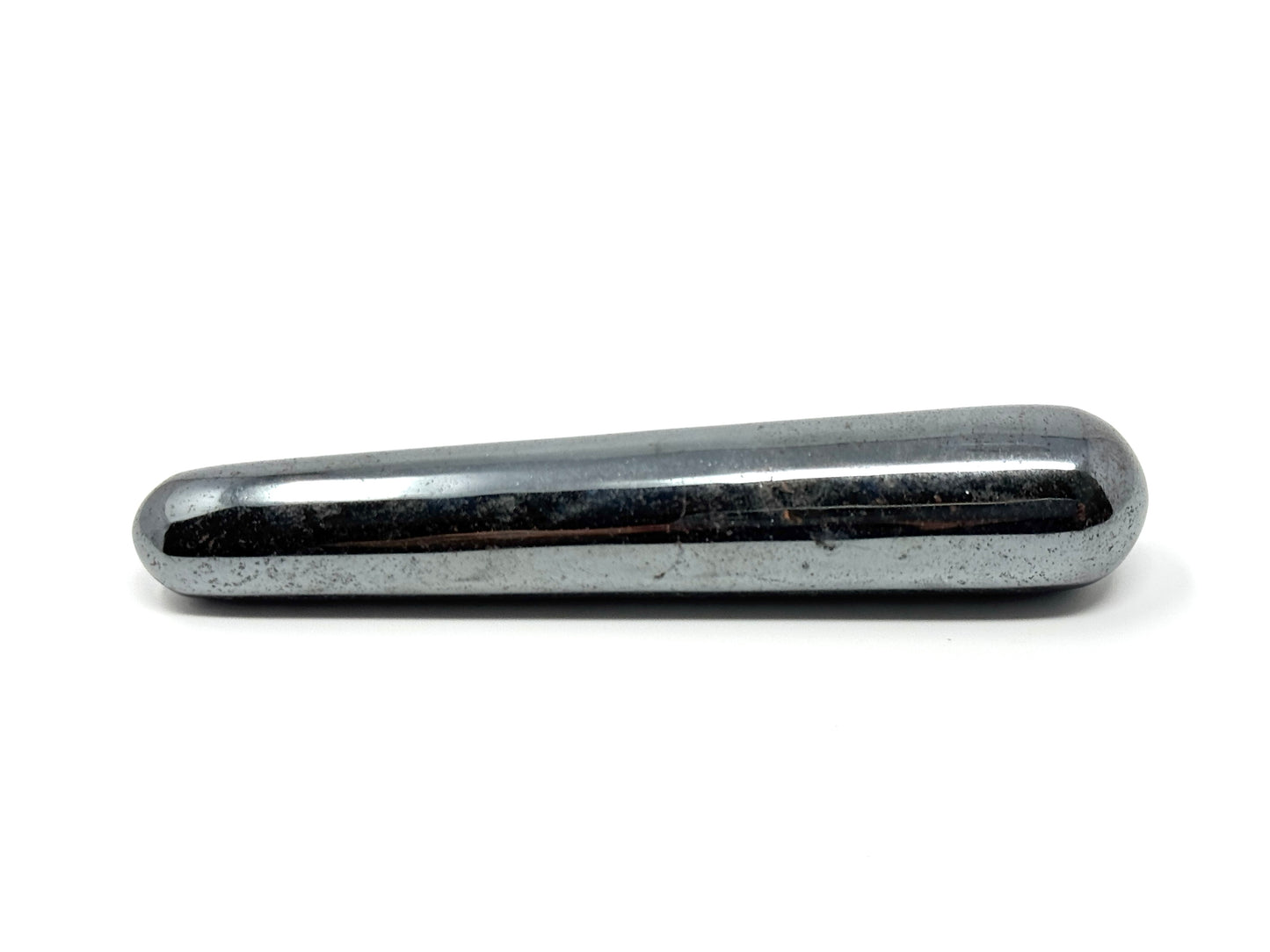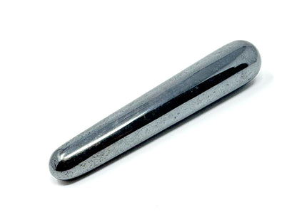 The Hematite Crystal has been cut and polished into a sleek, tactile crystal massage wand shape.