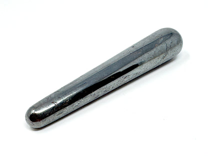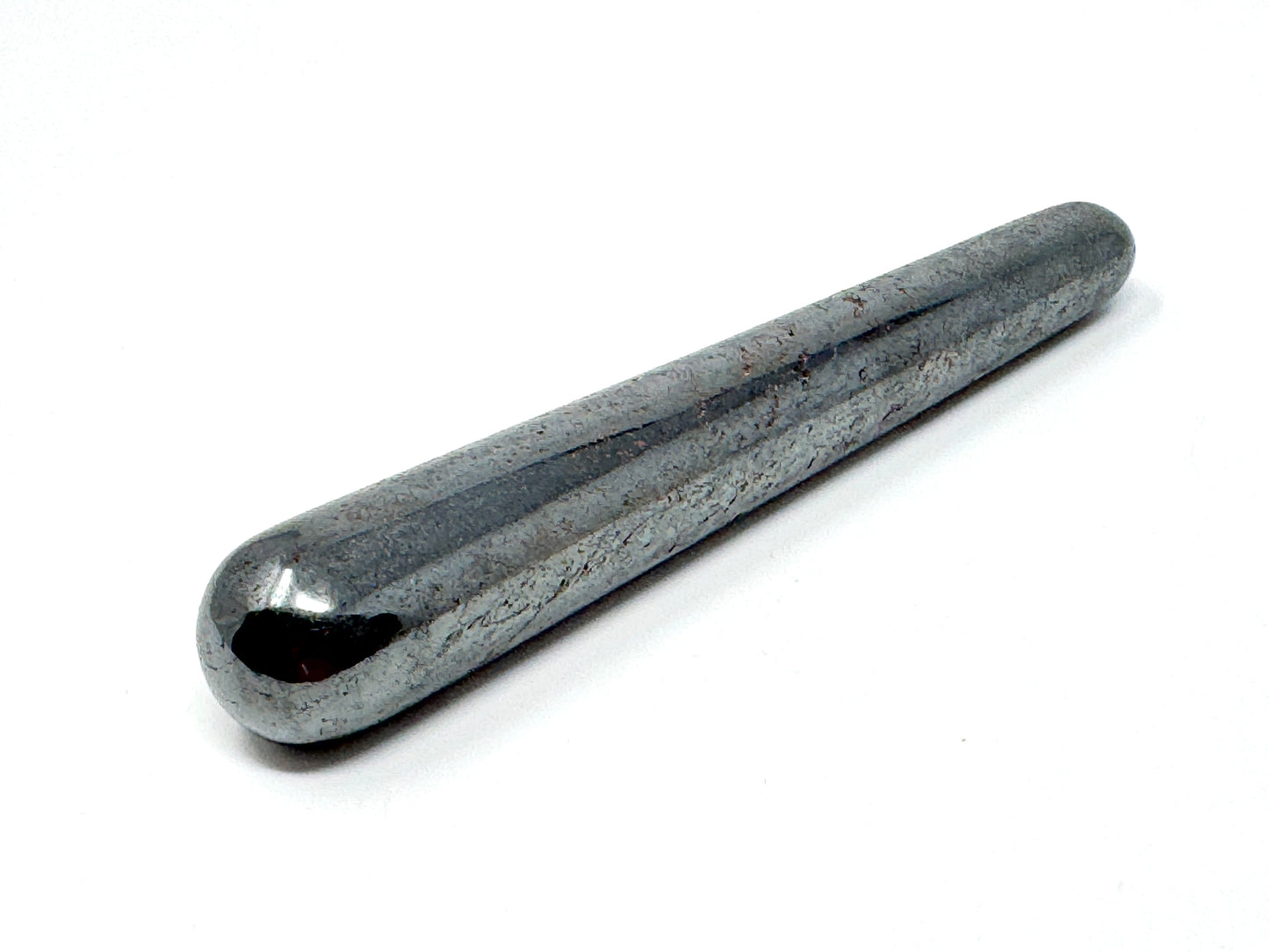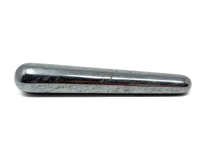 The Hematite Crystal has been cut and polished into a sleek, tactile crystal massage wand shape.
