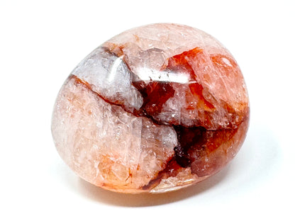 This gorgeous Hematoid Quartz Palm Stone displays bright, clear Quartz streaked with gorgeous lines of red.